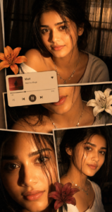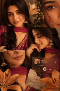 Warm-toned cinematic portrait collage of a young woman with soft glowing skin, subtle freckles, and glossy nude lips. She has long dark brown hair styled in loose waves with face-framing strands. She is wearing traditional gold jhumka earrings and a delicate necklace, dressed in a deep magenda outfit with a sheer dupatta around the neck. The lighting is golden-hour inspired with rich amber highlights and soft shadows, creating a cozy, intimate mood.The composition is a collage layout with multiple cropped frames of her face—close-ups of eyes, lips, and side profile-arranged aesthetically. Add soft floral elements like beige and orange lilies placed around the frame. Include a blurred music player overlay showing a song playing for a nostalgic vibe. Skin appears dewy and radiant, with minimal elegant makeup