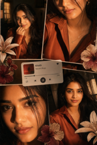 Subject Details: The subject has a sophisticated, “boss lady” aura, wearing a deep burnt-orange or rust-colored silk button-down shirt. Her makeup is polished with dewy skin, soft winged eyeliner, and a natural satin-finish lip. Small gold hoop earrings provide a subtle metallic accent. Lighting & Color: Warm, low-key lighting with a heavy “Golden Hour” glow. Use Rembrandt lighting to create soft shadows on the face.Subject Details: The subject has a sophisticated, “boss lady” aura, wearing a deep burnt-orange or rust-colored silk button-down shirt. Her makeup is polished with dewy skin, soft winged eyeliner, and a natural satin-finish lip. Small gold hoop earrings provide a subtle metallic accent. Lighting & Color: Warm, low-key lighting with a heavy “Golden Hour” glow. Use Rembrandt lighting to create soft shadows on the faceThe color palette is monochromatic earth tones: terracotta, amber, deep mahogany, and cream. Artistic Overlays: * Floral Elements: Layer 3D-effect vintage botanical illustrations (lilies and hibiscus) in muted burgundy and cream tones over the frame edges. UI Element: A minimalist, translucent white music player widget floating in the center-bottom, showing a play/pause button and a progress bar.Texture: Apply a subtle film grain, light dust scratches, and a slight “instant film” border around individual photos within the collage. Camera Metadata Simulation: Shot on Arri Alexa 65, 85mm prime lens, f/1.8 aperture for a soft background blur (bokeh), cinematic film stock aesthetic. Quick Tips for Best Results: Aspect Ratio: If using Midjourney, add –ar 2:3 or –ar 9:16 to the end.Macro Focus: If the AI struggles with the collage, generate the “macro lip shot” and the “medium portrait” separately, then use a layout tool to stitch them together with the floral stickers. Use given face 100% accurate