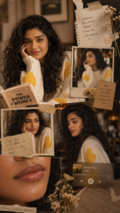 Cinematic Scrapbook Collage Prompt The Concept: > A high-end lifestyle photography collage featuring a young woman with voluminous, dark curly hair and a dewy “glass skin” complexion. The aesthetic is a blend of moody cinematic film and a digital scrapbook. Technical Specifications: Composition: A vertical 9:16 layout featuring multiple frames. Include a mix of medium shots and one extreme macro close-up focusing on the lips and chin.