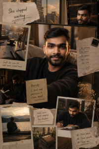 Prompt ⬇️⬇️⬇️ ultra-realistic cinematic scrapbook composition of a Male model, confident yet calm presence, soft but self-assured expression, natural beauty, relaxed posture that shows comfort in her own space, positioned near a window or open environment during golden hour theme: “Independent Spirit” the female model embodies quiet independence, someone who has built her own life, not seeking attention but fully grounded in her identity, her presence feels Free, intentional, and authenticclean layered scrapbook layout, intentional spacing, balanced negative space, premium editorial composition, realistic depth with soft shadows between paper layers environment: a personal space that reflects individuality — mix of cozy home elements and subtle city hints (window view, books, creative tools, coffee, soft fabrics), everything feels curated but lived-isurrounding elements: polaroid photos representing her journey (solo moments, quiet wins, self-growth, travel snippets, peaceful routines), handwritten notes, personal affirmations, sketches, minimal doodles, torn paper textures, subtle film strips visual storytelling progression: top layer (hook): handwritten text “She stopped waiting…” middle layer: the model in her own world — reading, creating, thinking, existing independently, surrounded by symbols of self-built lifepromptbit 4h lower layer: quiet victories — moments of peace, small achievements, choosing herself, calm solitude final focus: close-up with direct but soft gaze, grounded confidence, subtle power without needing validation lighting: warm golden hour light, soft highlights, gentle shadows, cinematic depth, natural skin texture, neutral warm tones (beige, cream, muted browns, soft gold)style: editorial photography, cinematic, introspective, minimalist scrapbook aesthetic, soft film grain, analog texture, light leaks, high detail, sharp focus on subject with subtle dreamy blur in background composition: clean, intentional, not cluttered, clear focal hierarchy, realistic perspective, premium magazine feel emotion: freedom, self-trust, authenticity, quiet strength, independence without isolation, peace in solitude keywords to reinforce:emotionally grounded, self-made, authentic lifestyle, quiet confidence, personal freedom, intentional living” “minimalist composition, strong subject focus, clean negative space, refined editorial layout” 🚫 NEGATIVE PROMPT: (worst quality, low quality:1.4), blurry, pixelated, jpeg artifacts, watermark, logo, text errors, misspelled text, random lettersbad anatomy, bad hands, extra fingers, missing fingers, deformed face, asymmetrical face, cross-eyed, duplicate subject, multiple faces, extra limbs, distorted body, unnatural pose, stiff posture plastic skin, overly smooth skin, harsh lighting, overexposed, underexposed, oversaturated, neon tones, flat lighting cluttered composition, chaotic scrapbook, messy layout, poor layering, floating objects, inconsistent shadows, warped perspective, distracting background 3d render, cgi, cartoon, anime, unrealistic proportions (excessive grain:1.2), (overly busy background:1.2), (text distortion:1.3)
