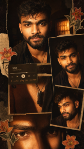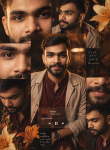 A warm-toned cinematic textured look with soft volume. He has a intimate mood. portrait collage of a young man with clear glowing skin, subtle texture, and natural matte lips. He has short dark brown hair styled in a slightly messy, defined jawline and sharp masculine facial features. He is wearing a stylish deep maroon kurta or a modern shirt layered with a light jacket, paired with a minimal chain and a wristwatch. The lighting is golden-hour inspired with rich amber highlights and soft shadows, creating a cozy. The composition is a collage layout with multiple cropped frames of his face—close-ups of eyes, jawline, lips, and side profile—arranged aesthetically. Add soft floral elements like beige and orange lilies placed around the frame for an artistic contrast. Include a blurred music player overlay showing a song playing for a nostalgic vibe. Skin appears natural, smooth, and slightly radiant with a clean look. Style: soft cinematic, editorial, aesthetic Instagram collage, warm c