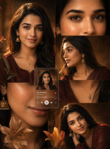 PROMPT⬇️ Warm-toned cinematic portrait collage of a young woman with glowing skin, subtle freckles, and glossy nude lips. Long dark wavy hair, gold jhumkas, delicate necklace, deep maroon outfit with sheer dupatta. Golden hour lighting with soft shadows for a cozy mood. Aesthetic collage of close-ups (eyes, lips, side profile), with beige/orange lilies and a blurred music player overlay for a nostalgic vibe. Dewy skin, minimal makeup.