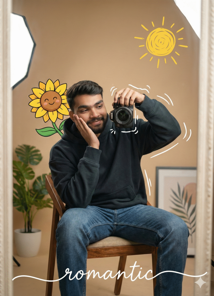 Aesthetic cozy mirror selfie of a young MAN sitting casually on a chair, wearing a dark oversized hoodie and blue jeans, holding a professional camera in one hand, resting her face on the other hand with a soft dreamy smile. Warm beige indoor background with soft studio lighting, minimal modern interior. Cute cartoon-style doodles around her including a smiling sunflower character and hand-drawn yellow sun, playful white sketch lines around the camera. Handwritten romantic.