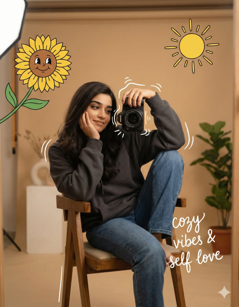 Aesthetic cozy mirror selfie of a young Girl sitting casually on a chair, wearing a dark oversized hoodie and blue jeans, holding a professional camera in one hand, resting her face on the other hand with a soft dreamy smile. Warm beige indoor background with soft studio lighting, minimal modern interior. Cute cartoon-style doodles around her including a smiling sunflower character and hand-drawn yellow sun, playful white sketch lines around the camera. Handwritten romantic.
