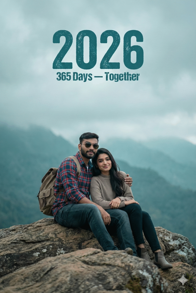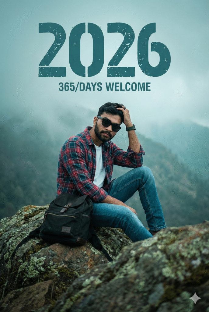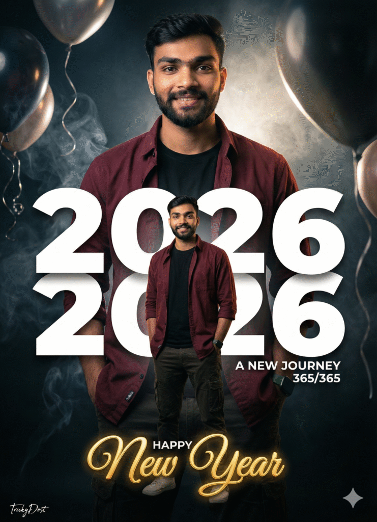Uploaded man wearing a open marun shirt with black t shirt and cargo. The composition is double exposure style: a large, dominant portrait of the man in the background, with a smaller, full body version of him layered in the foreground. Dominant text in a modern, bold font “2026” with the subtitle “A NEW JOURNEY” and “365/365”. At the bottom, stylized, glowing cursive text says “HAPPY New Year”. Baground dark and lighting, flowing baluns, smoke behind his. A small TrickyDost signature in left corneโฆSMILING]