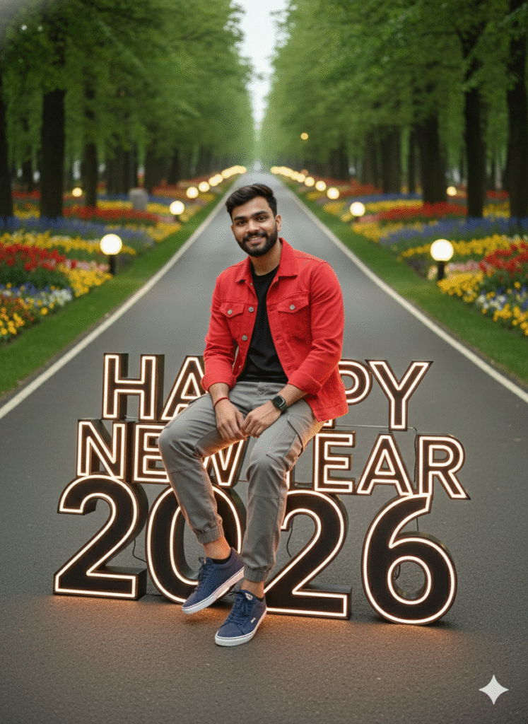 A young stylish man sitting confidently on large “Happy New Year2026” numbers placed on a road in a beautiful park. The numbers have a futuristic black outline. He is wearing a black shirt, red denim jacket, grey cargo, and blue sneakers. The background shows green trees, colorful flowers, and a soft lights. The atmosphere feels modern, cinematic and positive – symbolizing a fresh new year and new beginnings, ultra realistic, depth of field, perfect lighting. ..