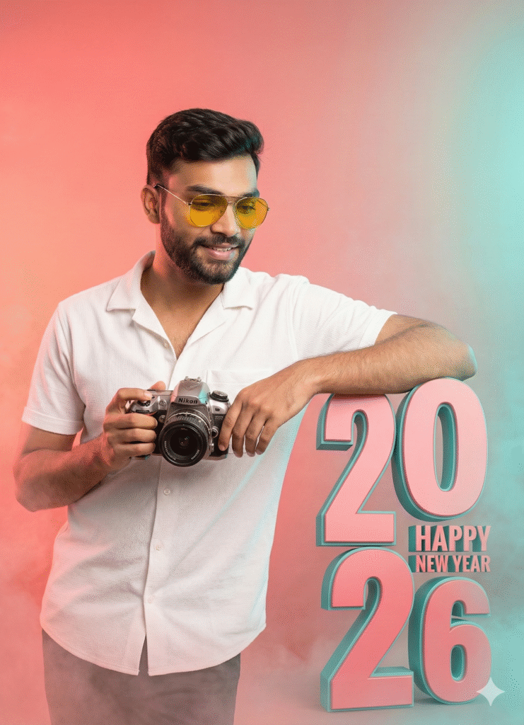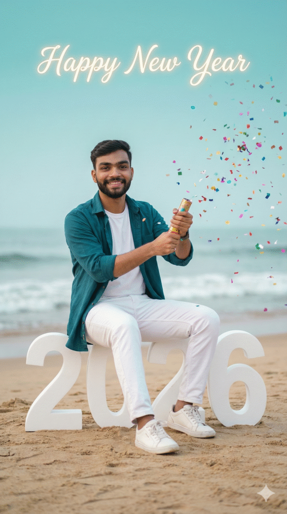 Use the uploaded photo face as the main subject. Create a realistic New Year celebration photo at a beachside location. The person is sitting confidently on large white โ2026โ numbers placed on sand near the ocean. Outfit: โ Teal/sea-green open shirt โ White t-shirt inside โ White pants โ White sneakers Pose & Expression: โ Sitting relaxed โ Smiling confidently โ Both hands holding a party popper, just popped Action & Effects: โ Colorful confetti frozen mid-air โ Celebration moment captured naturally Background: โ Soft turquoise sky โ Calm ocean waves slightly blurred โ Minimal, clean, premium look Text: โ โHappy New Yearโ written at the top in soft glowing cursive font Lighting & Style: โ Natural daylight โ Soft cinematic lighting โ Clean skin tones, realistic texture โ DSLR photography look Quality & Framing: โ Ultra-realistic โ High resolution โ Shallow depth of field โ Sharp focus on subject โ Vertical 9:16 Instagram-ready composition Do not change face identity. No extra text. No watermark.