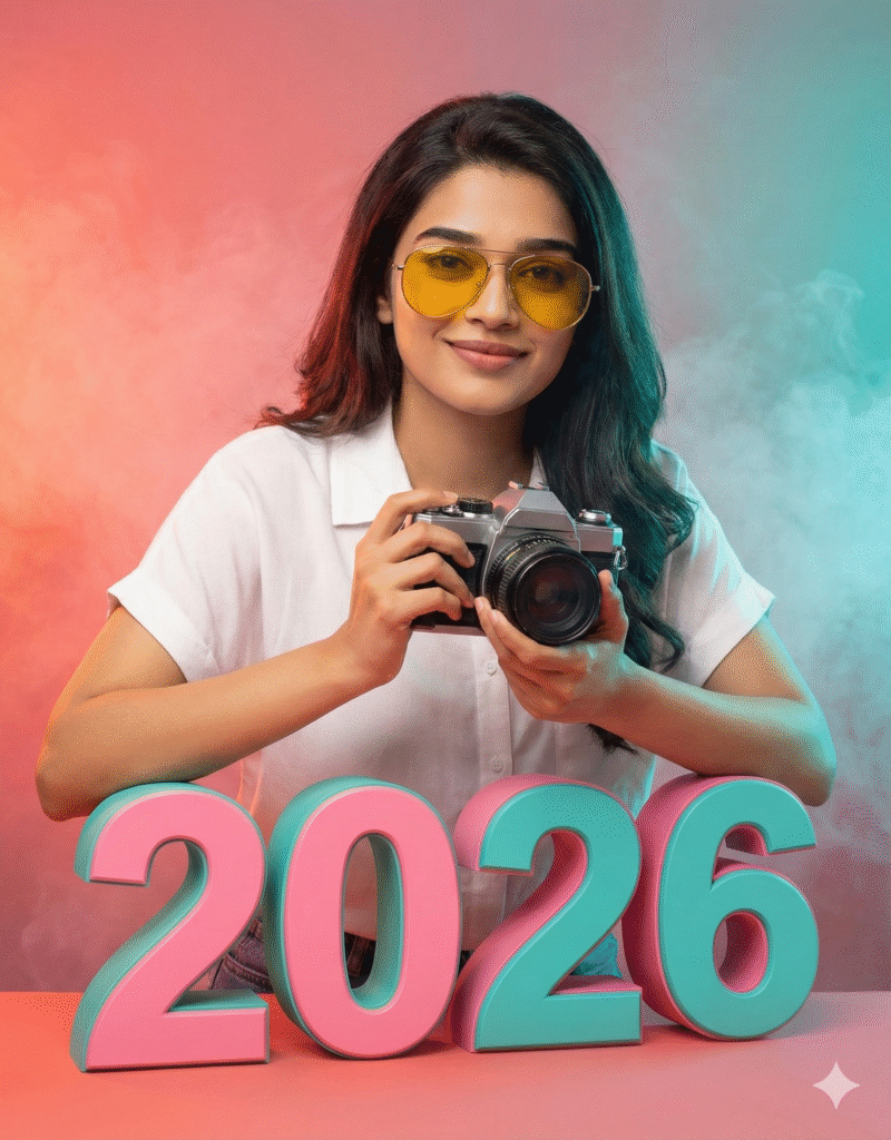 number “2026” rendered in pink and teal tones.The background features a smooth gradient of warm pink, coral, and teal colors with a soft cinematic glow. The lighting is bright and vibrant, giving the scene a modern poster-like aesthetic. Add subtle smoke/mist at the.