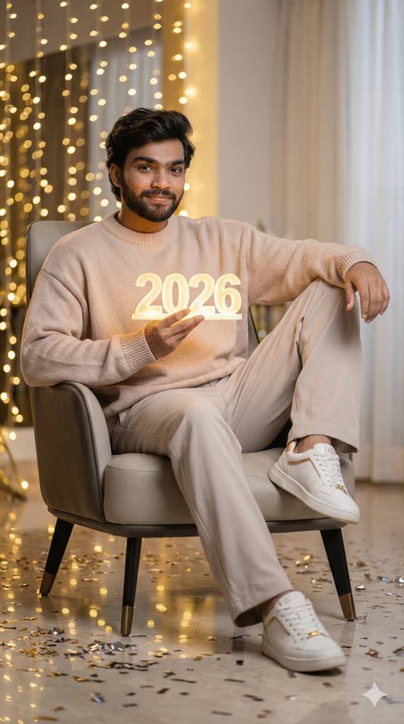CREATE AN ULTRA-AESTHETIC, HIGHLY REALISTIC FULL-BODY PORTRAIT OF A YOUNG MALE MODEL (100 PERCENT MATCH WITH ATTACHED IMAGE) CELEBRATING “HAPPY NEW YEAR 2026* IN A LUXURIOUS INDOOR WINTER-THEMED SETTING, SITTING CASUALLY ON MODERN SLEEK ARMCHAIR WITH SOFTLY BLURRED GOLDEN FAIRY LIGHTS IN THE BACKGROUND, SUBTLE AMBIENT REFLECTIONS ON POLISHED FLOOR, TINY SHIMMERING CONFETTI SCATTERED AROUND, AND DELICATE SOFT GLOW FROM AMBIENT LIGHTING. THE MODEL’S HAND IS ELEGANTLY HOLDING A GLOWING 3D “2026” TEXT ABOVE HIS HAND, CASTING WARM REFLECTIONS ON HIS FACE AND CLOTHES. HE WEARS A COZY OVERSIZED PASTEL BEIGE KNIT SWEATER, PAIRED WITH LOOSE OVERSIZED TROUSERS IN SOFT NEUTRAL TONES, AND BOLD WHITE DESIGNER SNEAKERS WITH SUBTLE GOLDEN ACCENTS ON SOLES AND LACES. HAIR IS STYLED NATURALLY WITH SOFT VOLUME. FACE SHOWS A GENTLE CONFIDENT SMILE, RELAXED EYES CONVEYING CALM JOY. CINEMATIC SOFT LIGHTING ILLUMINATES TEXTURES OF SKIN, FABRICS, AND REFLECTIONS FROM GLOWING TEXT. POSE IS AESTHETIC AND RELAXED, LEANING SLIGHTLY SIDEWAYS WITH ONE ELBOW ON THE ARMREST AND OTHER HAND HOLDING GLOWING TEXT. ULTRA- DETAILED PHOTOREALISTIC 4K QUALITY, 9:16 VERTICAL RATIO, SHALLOW DEPTH OF FIELD KEEPING THE MODEL IN CRISP FOCUS WHILE SOFTLY BLURRING BACKGROUND. EVERY ELEMENT INCLUDING OVERSIZED LOOSE PANT, SNEAKERS. SWEATER, HAIR, LIGHTING, CONFETTI, REFLECTIONS, AND GLOWING 3D “2026” TEXT PERFECTLY INTEGRATED FOR MAXIMUM FESTIVE, MODERN, LUXURIOUS. AND HIGH-FASHION AESTHETIC..