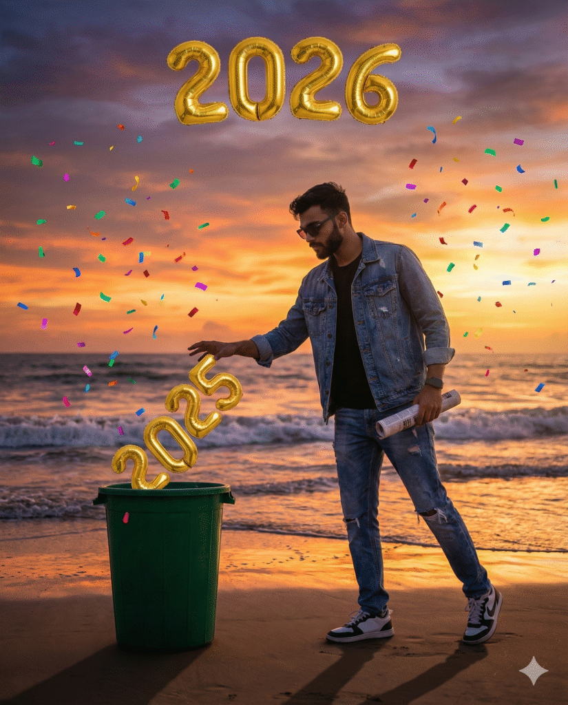A young stylish boy standing on a beach at sunset, throwing away golden balloon numbers โ2025โ into a green dustbin, holding a rolled newspaper, wearing casual streetwear outfit, ripped jeans and sneakers, modern hairstyle, sunglasses, colorful confetti flying in the air, golden balloon text โ2026โ floating above, ocean waves in background, dramatic sky, creative New Year concept, cinematic lighting, ultra-realistic, high detail, sharp focus, vibrant colors, 4K Instagram creative edit styleโ.