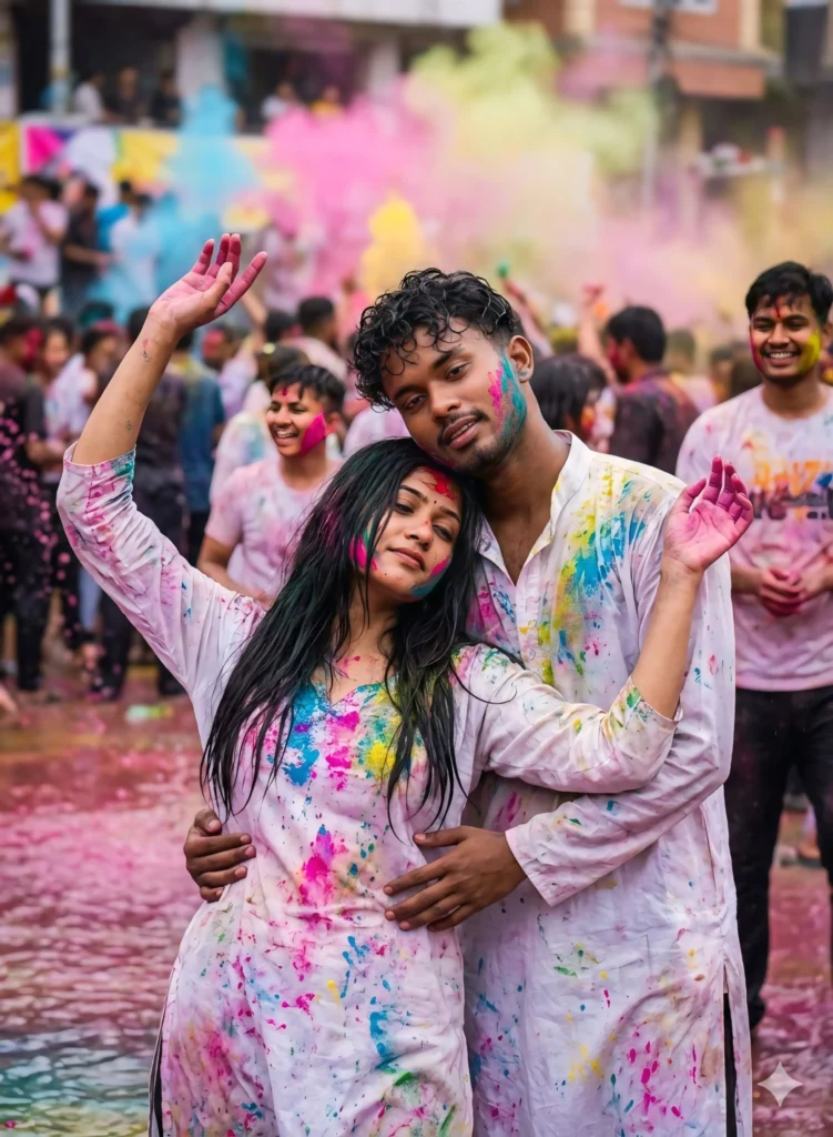 Ultra-realistic cinematic photography of a young Indian romantic couple (early 20s, identical symmetrical faces: man with chiseled jaw, deep brown eyes, short messy black hair; woman with matching facial structure adapted femininely, flowing black hair, same expressive eyes) during Holi festival, defeated tired poses after wild color play-she slumped against his chest with arms weakly raised in playful surrender, vibrant gulal powders in pinks, blues, greens, yellows splattered on soaked white.@nagpurihiphoplover