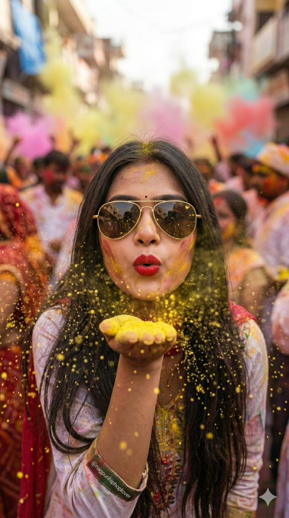 Medium close-up shot of the same woman wearing reflective green sunglasses, red and yellow gulal on her face. She is blowing yellow Holi powder from her hand toward the camera, powder frozen mid-air, dramatic golden sunlight glow, soft green outdoor background blur, high shutter speed effect, vibrant festive mood.