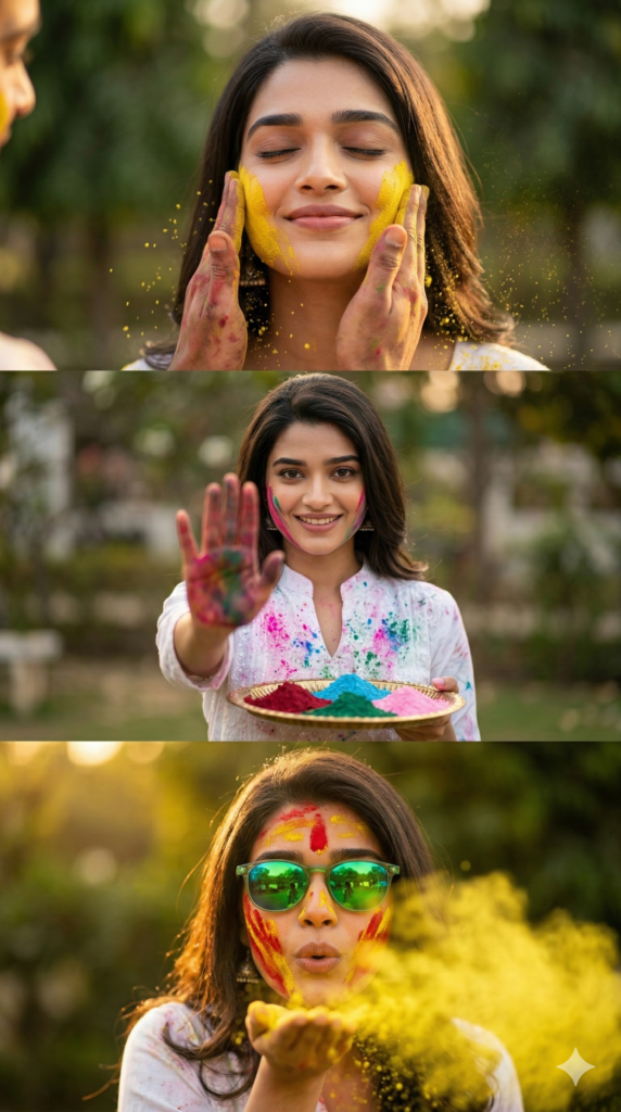 Create a hyper-realistic ultra HD cinematic 3-frame vertical collage of a young Indian woman celebrating Holi during golden hour. The image should be divided into three equal horizontal sections (top, middle, bottom), seamless transitions, Instagram 9:16 ratio.