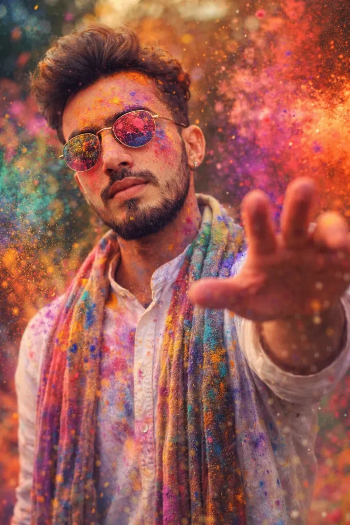 Ultra-realistic Cinematic Holi Portrait Of A Young Man (Early 20s) With The Same Face As The Uploaded Image. He Is Wearing A White Kurta With A Long Scarf/Dupatta And Stylish Sunglasses Covered In Colorful Gulal Powder. He Raises One Hand Forward As Bright Color Dust Explodes Dramatically In The Air Around Him. Soft Expression With Eyes Slightly Closed, Light Beard Outdoor Background With Dreamy Bokeh Effect, Vibrant Holi Festival Vibe, Shallow Depth Of Field, Dynamic Color Particles, High