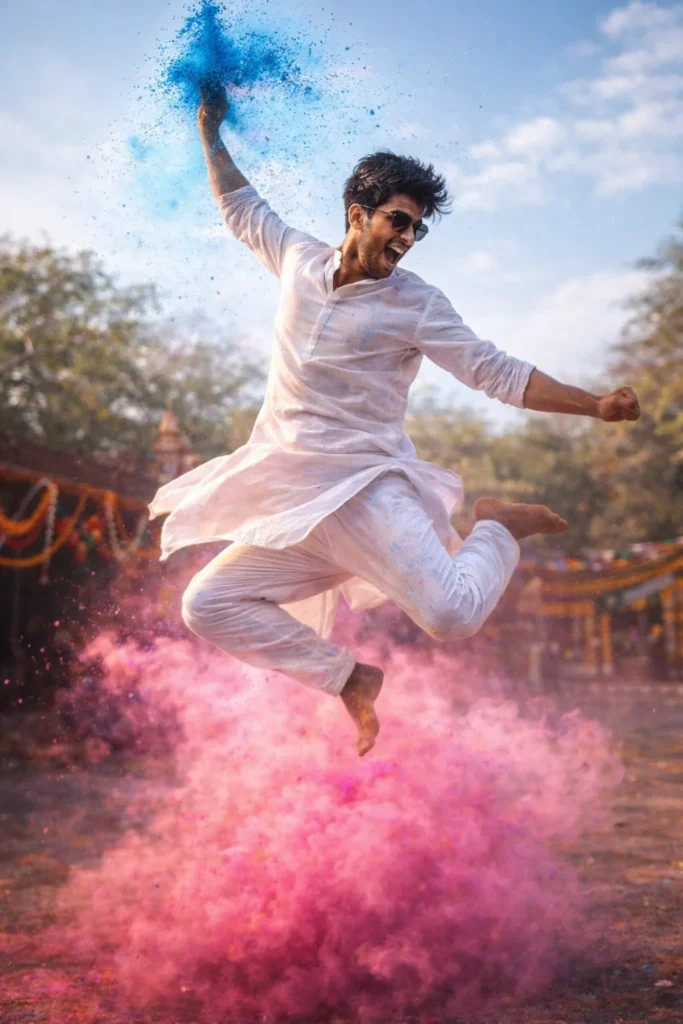 Energetic Holi scene of a young man in a white kurta mid-jump while throwing blue powder upward. Pink smoke exploding at ground level. Kurta flaring naturally in air. Wide dynamic frame, high shutter speed freezing airborne particles. Bright natural light, DSLR 35mm lens, sharp clarity, bold festive energy.