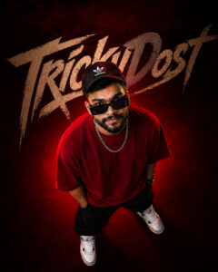 High-angle shot (view from above) of a man who is a 100% likeness to the person in the uploaded image, taking into account the hairstyle, beard, eyebrows, and skin tone in a detailed manner, looking up at the camera with a confident expression. He is wearing a black Adidas flat cap, modern elongated sunglasses, a thick silver chain, a blood-red oversize shirt, baggy black pants, and white Jordan Retro sneakers with red details. n the background, which is a dark red gradient, there is a large “TrickyDost” graphic element in cream and gray tones. The lighting is dramatic, with a red glow enveloping the scene and a spotlight highlighting the face. High-definition cinematic photographic style, with sharp textures on the skin, hair, clothing fabric, and sneakersThe colorimetry is dark and stylized, with red as the dominant color and white/cream as graphic accents. 4:5 aspect ratio, 8k premium high-end cinematic quality.