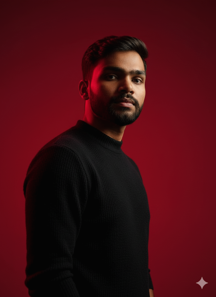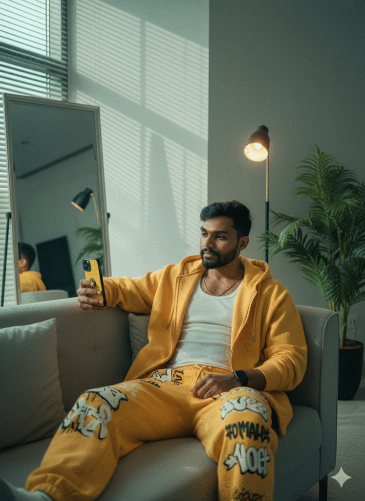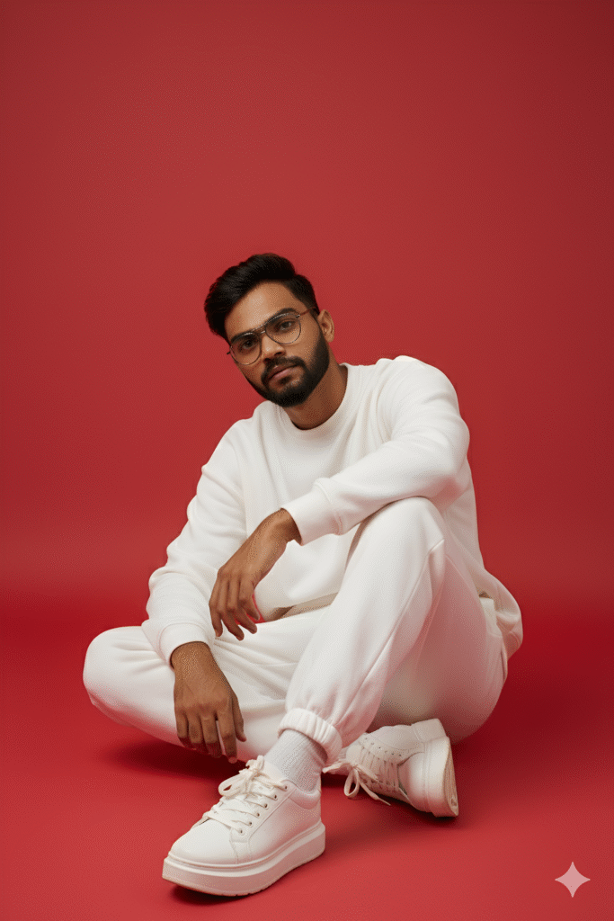 PROMPT #19 – “Stylish fashion editorial photo of a male model wearing an oversized white sweatshirt and white sweatpants, paired with white sneakers. A soft red studio backdrop with soft cinematic lighting, highlighting textures, futuristic editorial style, model sitting elegantly, head slightly tilted, relaxed posture.” PROMPT #20 – Use my prompt “Ultra-realistic cinematic photo of a stylish young man sitting on a luxury salon chair in front of a big mirror, holding an iPhone 13 and clicking a selfie. He is wearing a trendy modern outfit with sunglasses/watch, giving a confident fashionable vibe. The background shows salon interiors with glowing vanity lights, hair products on the counter, and glossy reflections in the mirror. The scene has a cinematic lifestyle tone, shot with a Sony A7R IV, 35mm f/1.4 lens,