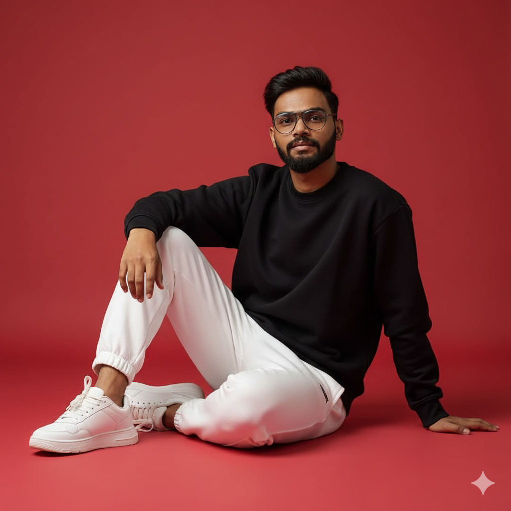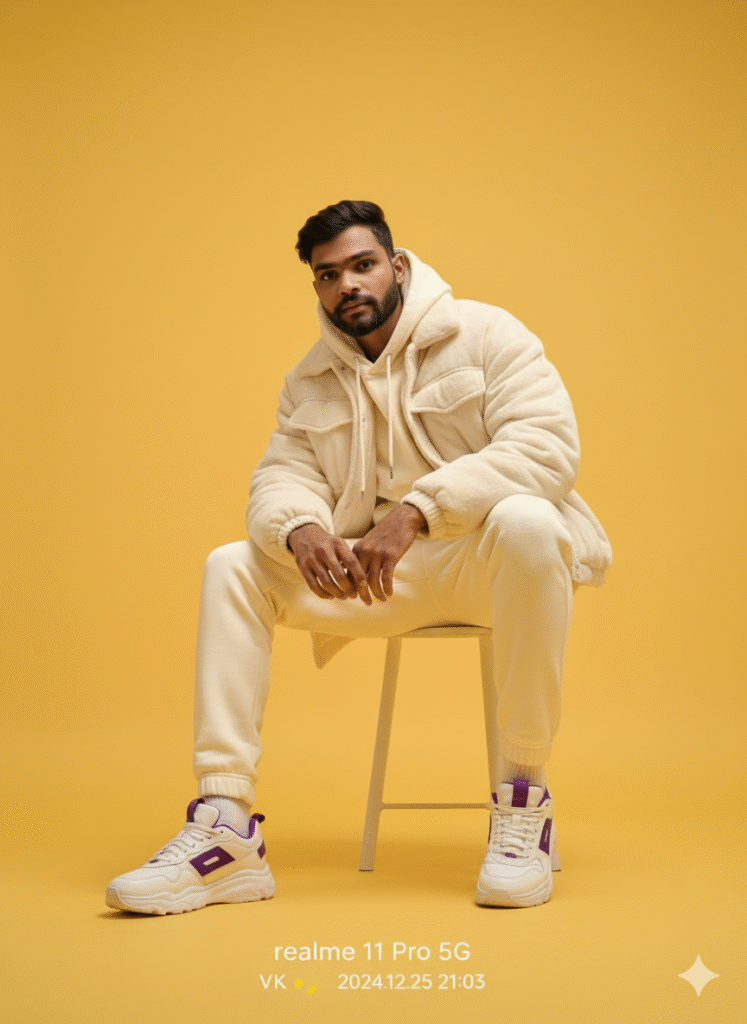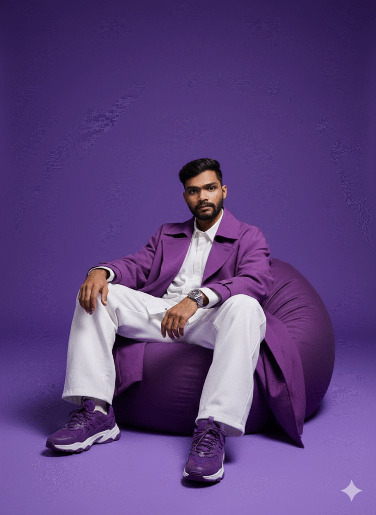 PROMPT #1 – “Stylish fashion editorial photo of a male model wearing an oversized white sweatshirt and white sweatpants, paired with white sneakers. A soft red studio backdrop with soft cinematic lighting, highlighting textures, futuristic editorial style, model sitting elegantly, head slightly tilted, relaxed posture.” PROMPT #2 – Hyper-realistic urban fashion portrait of a young man sitting in a stylized pose, with a low angle emphasizing his sneakers. He wears an oversized light-toned athletic outfit, featuring a hoodie and a voluminous plush jacket. The sneakers have a modern design, white with vibrant purple details, creating a striking contrast against a vivid Butter Yellow (#F6D860) background. The setting is minimalist, with a solid yellow backdrop that highlights the figuresPROMPT #3 – Ultra HD 8K Photorealistic ultra HD 8K portrait of a well-groomed man with dark hair and a full beard in a perfectly tailored black three-piece suit, white dress shirt, black silk tie and white pocket square, wearing matte black sunglasses and adjusting a luxury wristwatch with both hands. Low-key studio lighting from the subject’s right creating dramatic Rembrandt shadows and a crisp cast shadow on a neutral wall.