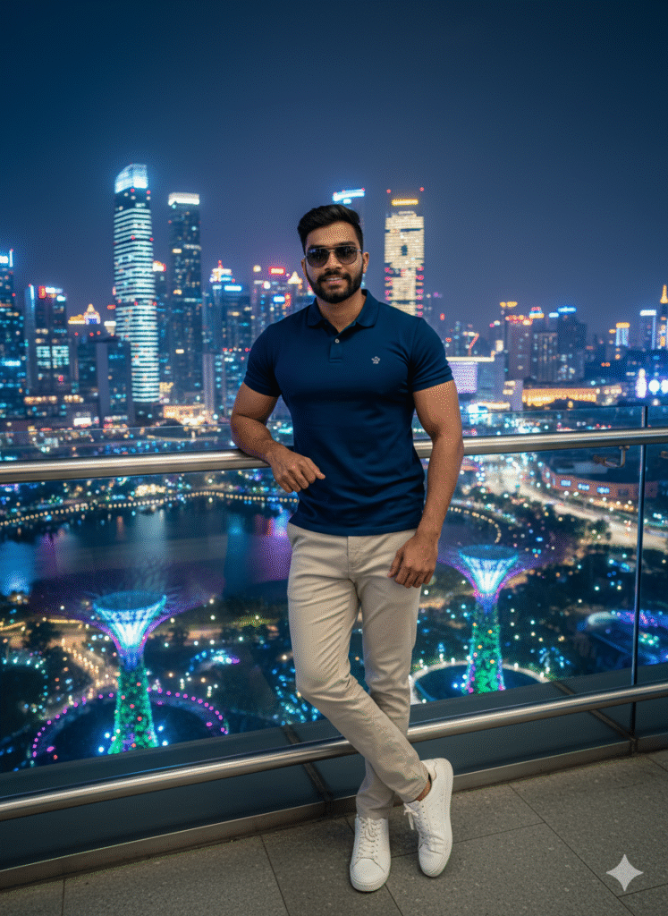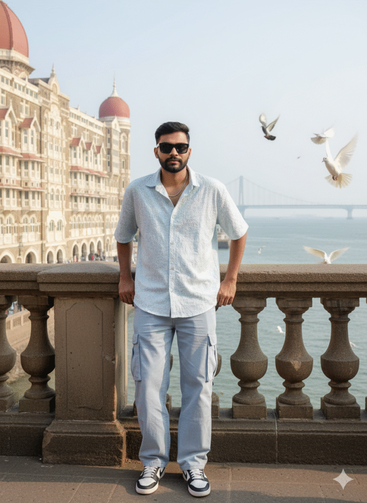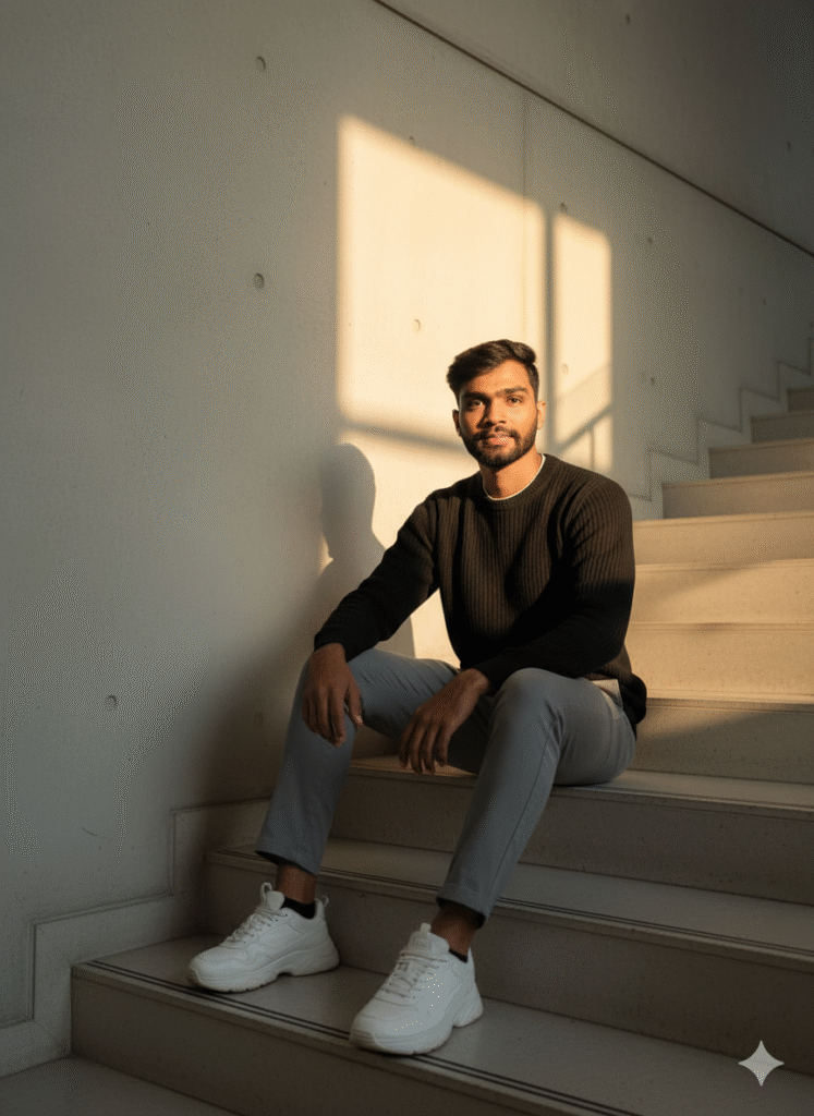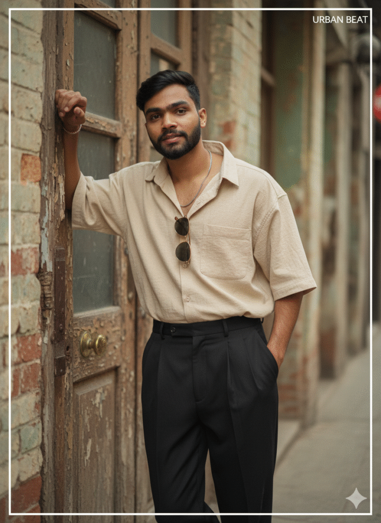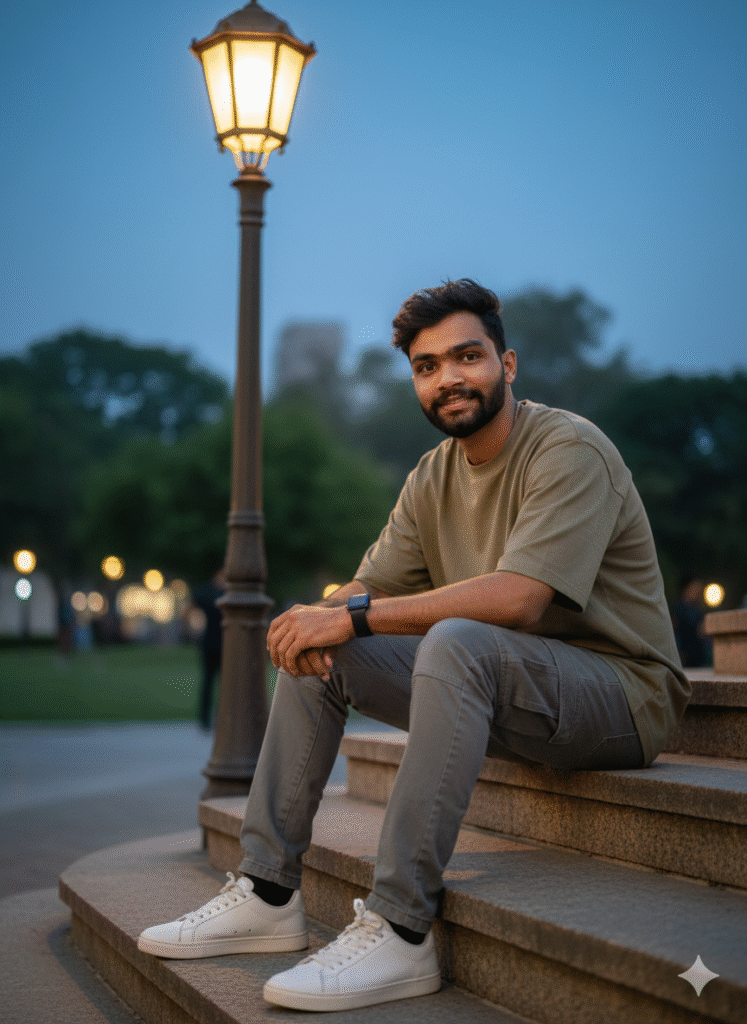 PROMPT #10 – A 90s vintage editorial-style portrait of a young man (face reference from uploaded photo) leaning casually against an old rustic doorway. He poses with one hand gripping the chipped wooden door and the other tucked in his black pleated trousers, exuding effortless confidence. He wears a loose beige short-sleeve button-up shirt, slightly unbuttoned at the chest with sunglasses hanging from the collar, styled in a retro casual wayPROMPT #11 – Cinematic hyper-realistic shot of a 21-year-old man sitting on stone stairs beside an old lamp post at twilight. Soft smile, arms resting on knees. Outfit: Khaki Heavyweight oversized t-shirt, grey cargo pants, white sneakers, apple watch, slightly messy dark hair. Background: glowing streetlight, blurred trees, creamy bokeh, 8K detail.