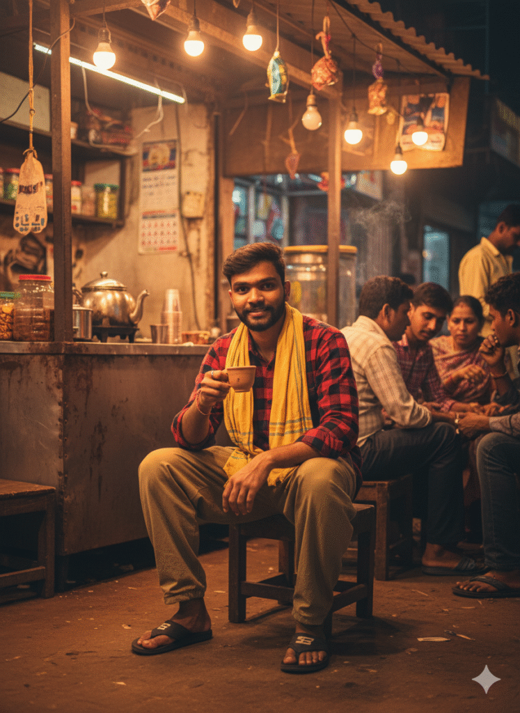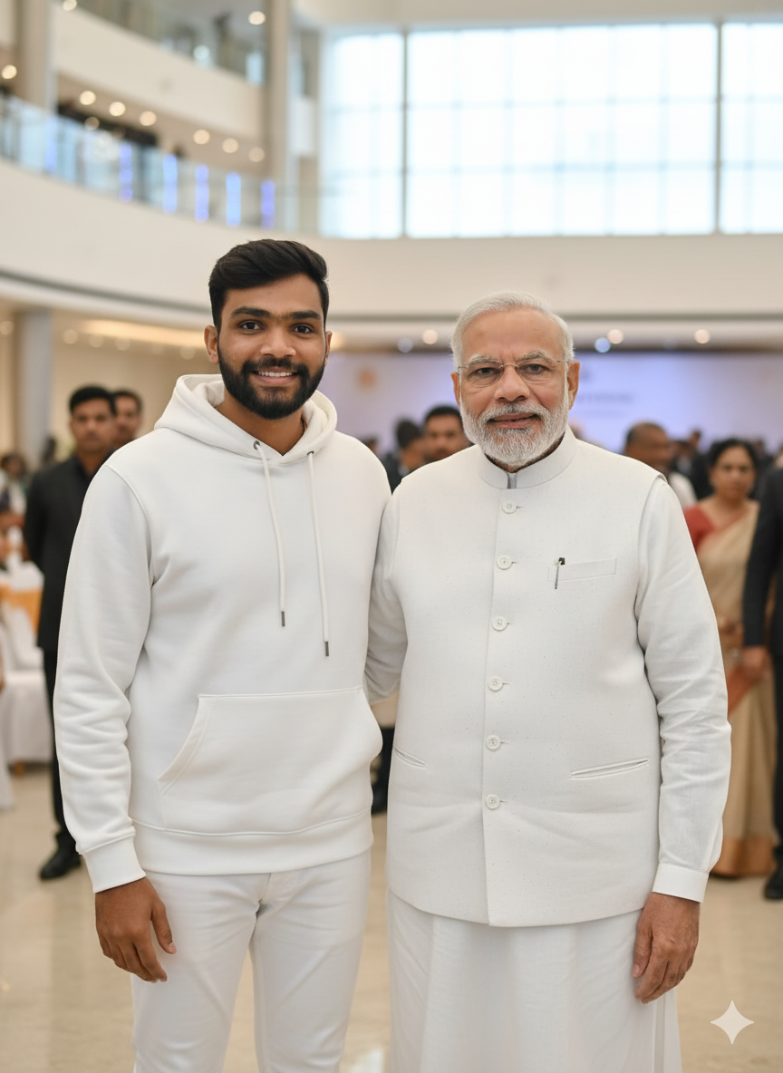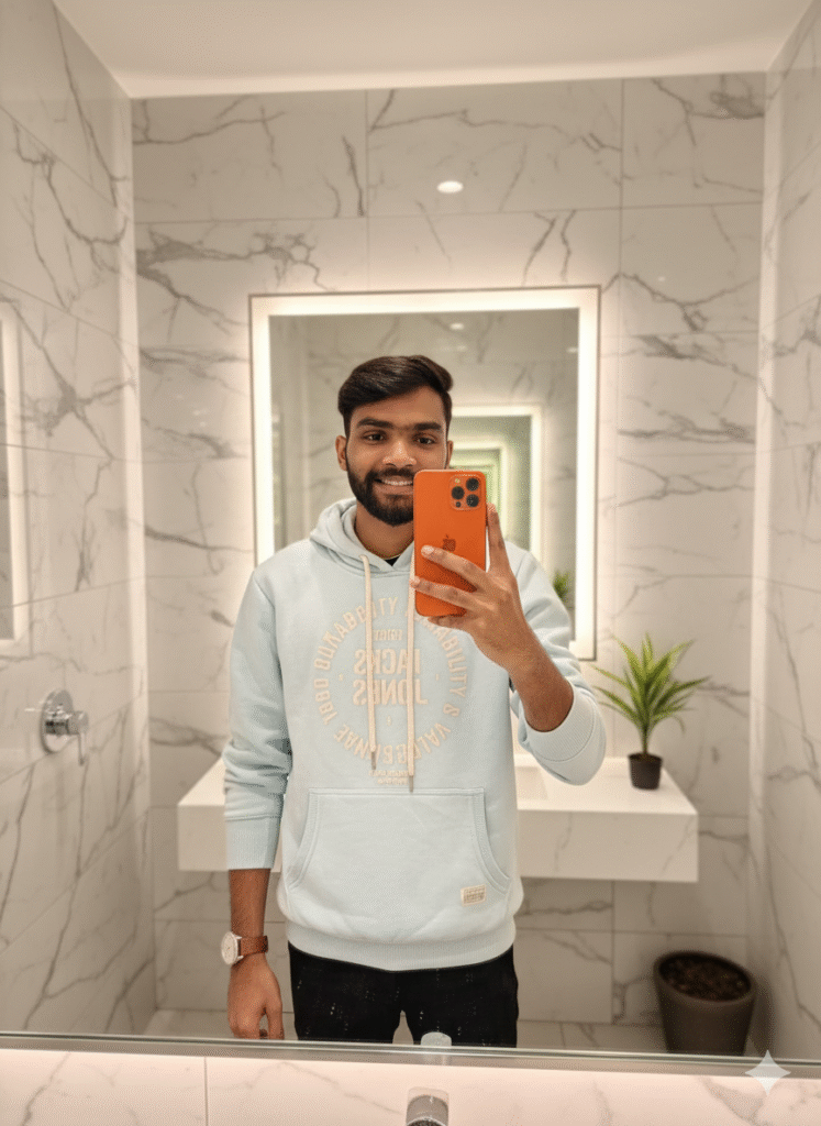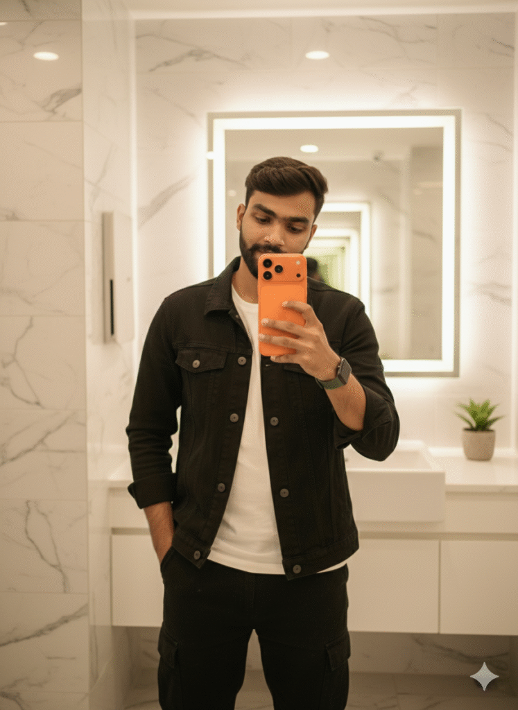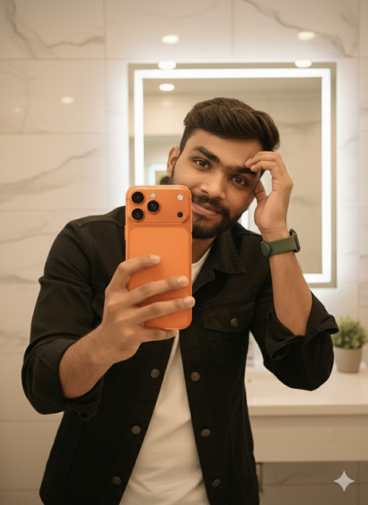 Create an image showing the person in the first photo taking a selfie in the second photo in a restaurant with a candlelight setting. Show both of them side by side. Make the setting look real.” Prompt 2: “Create an image showing the person in the second photo taking a selfie (keep the face expressions and look the same) with Narendra Modi in the first photo at his office, both of them side by side, standing.”“Ultra-realistic 8K cinematic portrait of indoors, leaning against a light wall in a luxurious setting, wearing sunglasses a white Balmain hooded robe with gold logo print, matching belt, and silver pendant necklace, holding a patterned mug and checking his phone with a thoughtful gaze, styled hair slightly messy, dramatic warm highlights and soft shadows for a magazine-editorial look.”Generate this updated selfie into a premium-looking bathroom selfie. The bathroom should appear contemporary with polished tiles, good lighting, and a mirror in the background. The person must be holding the orange iPhone 17 Pro Max new version original same image. Realistic portrait, making the phone stand out as reflective, bold, and high-end. The selfie should have natural blur with a touch of elegance, keeping the focus on the person and the iPhone while the background remains non-distracting../ dont change face color,,..