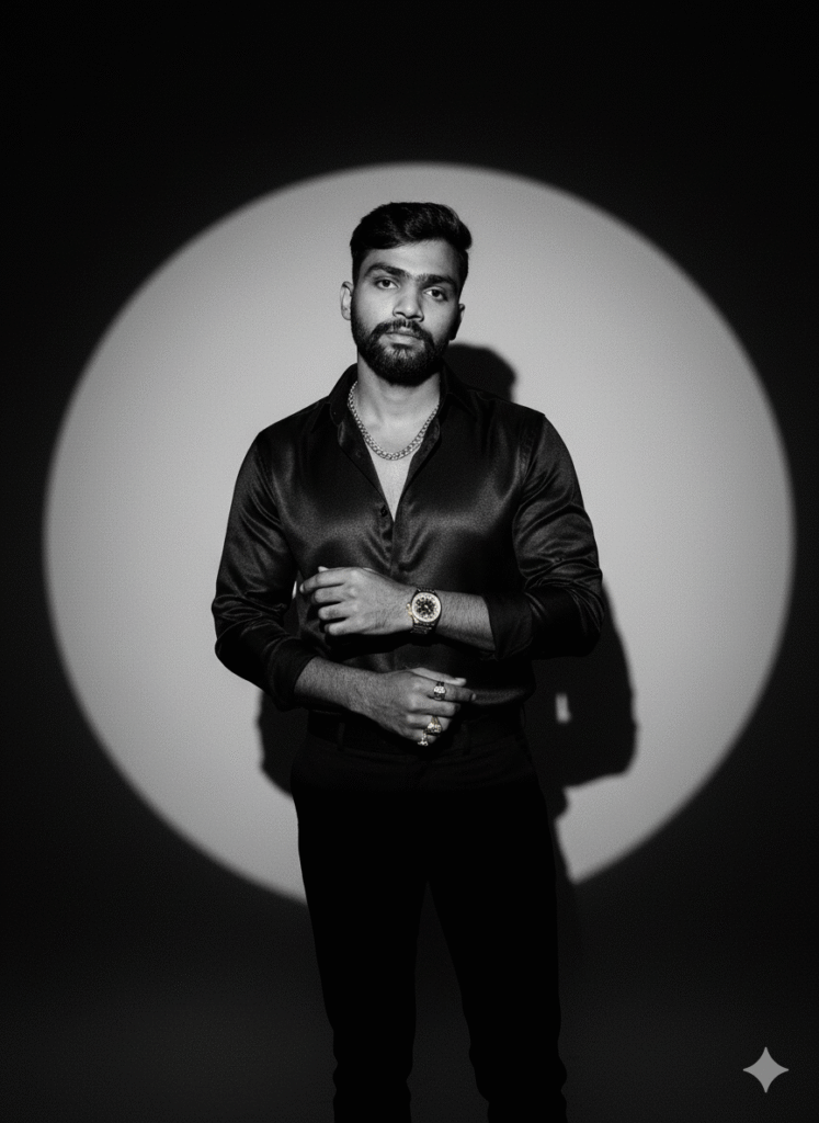Using this picture, create in a men in a black silk shirt and black trousers standing pose against a dramatic circular spotlight backdrop. He wears gold chain and some gold and diamond rings, gold watch sleave roll showing his face with slightly tilted chin gracefully. The image is in black and white, with cinematic lighting and deep shadows, creating a timeless, vintage-inspired fashion editorial look 100 % accurate same face with same be