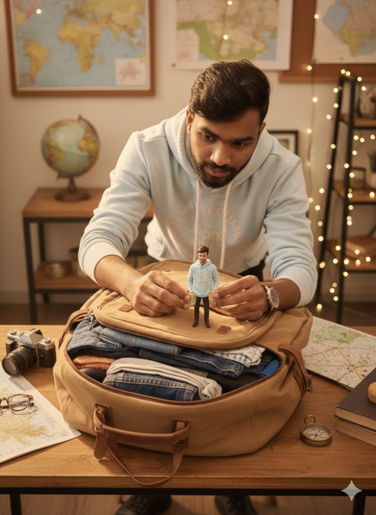 PROMPT #12 – A 1/7 scale figurine of the man (from uploaded photo) standing on top of an open travel backpack on a desk. The real-life man carefully positions the figurine while packing travel gear around it. Background shows maps, a globe, and a cozy travel-themed room.”