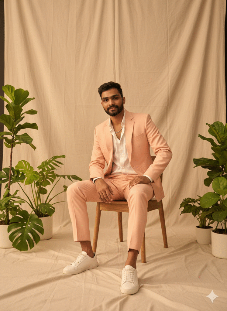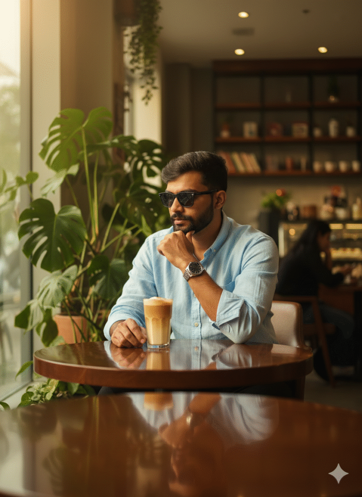 “A stylish young man sitting on a wooden chair indoors, dressed in a pastel peach suit with a white shirt and white shoes, posing with a confident and relaxed expression. Minimalist studio setting with beige fabric backdrop and potted green plants placed around him, creating a soft, elegant, and modern aesthetic. Fashion photoshoot lighting with a warm and natural tone “A stylish man is sitting in a café. He is wearing a light-colored shirt, a wristwatch, and sunglasses. He looks thoughtful while posing, with a cold coffee drink placed in front of him. His reflection is clearly visible on the shiny table. The background has green plants and a cozy café atmosphere. Describe or visualize this scene in a cinematic, high-resolution, natural light style..
