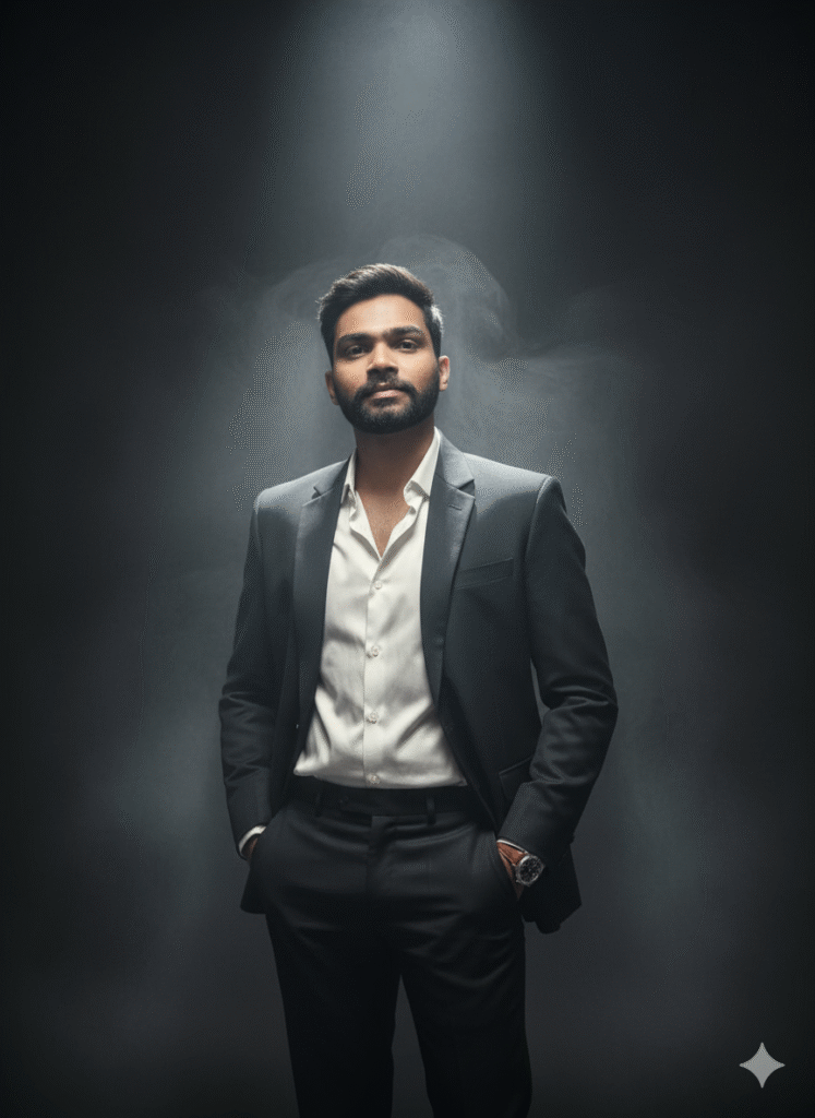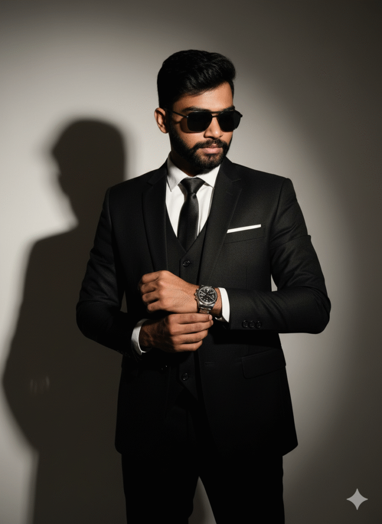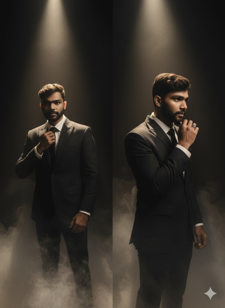 PROMPT #8 – Ultra HD 8K Photorealistic ultra HD 8K portrait of a well-groomed man with dark hair and a full beard in a perfectly tailored black three-piece suit, white dress shirt, black silk tie and white pocket square, wearing matte black sunglasses and adjusting a luxury wristwatch with both hands. Low-key studio lighting from the subject’s right creating dramatic Rembrandt shadows and a crisp cast shadow on a neutral wall.PROMPT #9 – Generate a hyper-realistic cinematic editorial portrait of the uploaded person (preserve exact real face, hairstyle, skin tone, and body identity no changes). Scene: dark moody studio with thick smoke drifting low across the floor, adding depth and mystery. Lighting: single dramatic beam from top-left, creating strong chiaroscuro shadows, with rim light outlining suit textures and jawline. Composition: two versions of the same person.