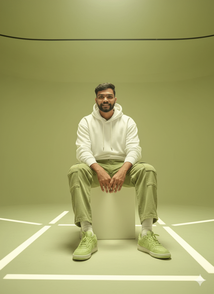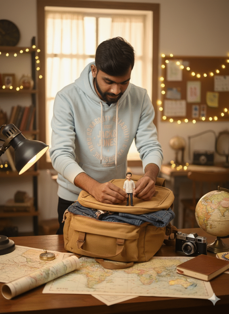 PROMPT #13 – A 1/7 scale figurine of the man (from uploaded photo) standing on top of an open travel backpack on a desk. The real-life man carefully positions the figurine while packing travel gear around it. Background shows maps, a globe, and a cozy travel-themed room.”PROMPT #14 – Hyper-realistic cinematic fashion photoshoot of the uploaded person (age 25, height 5’5″). He has a refined slim face with a lean, elegant physique. Seated on a deep purple bean bag, he wears bold all-purple oversized streetwear: trench coat, wide white pants, chunky sneakers, silver watch. Solid purple background, medium-length wavy hair. Powerful drip vibes, Adidas campaign editorial look, dramatic studio lightingPROMPT #15 – Subject : male model (same face & hairstyle as uploaded photo, do not change facial expression). wearing outfit : oversized white sweatshirt, lemon green oversized combat jean, styled with footwear : lemon green neutral or nike sneakers and white ribbed socks. Environment : muted lemon green-toned studio background. Lighting: soft cinematic glow highlighting skin and fabric textures. Style : fashion editorial x futuristic. Composition : model seated elegantly with relaxed posture