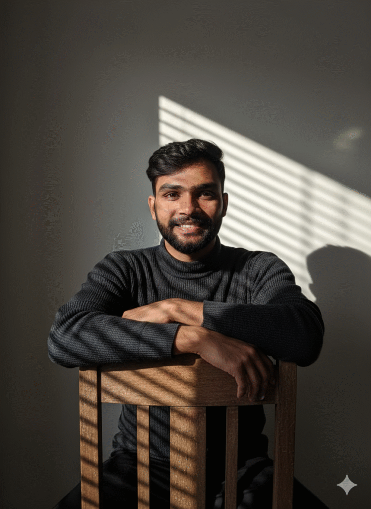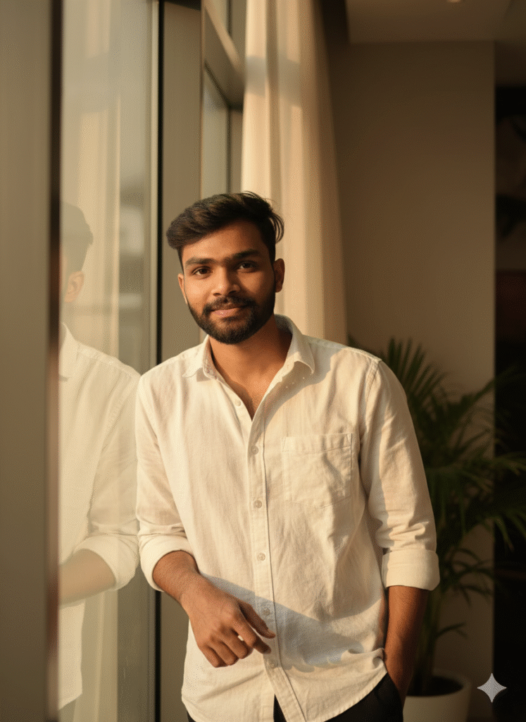 PROMPT #4 – google gemini Create a softly lit portrait of the uploaded person standing indoors near a window with warm sunlight streaming through. Use a cinematic, golden-hour lighting style that highlights the face and hair with natural glow and soft shadows. The person should be wearing a loose, casual white shirt with slightly rolled-up sleeves. The mood should feel calm, dreamy, and natural, with soft depth of field and a warm, intimate atmosphere.”
