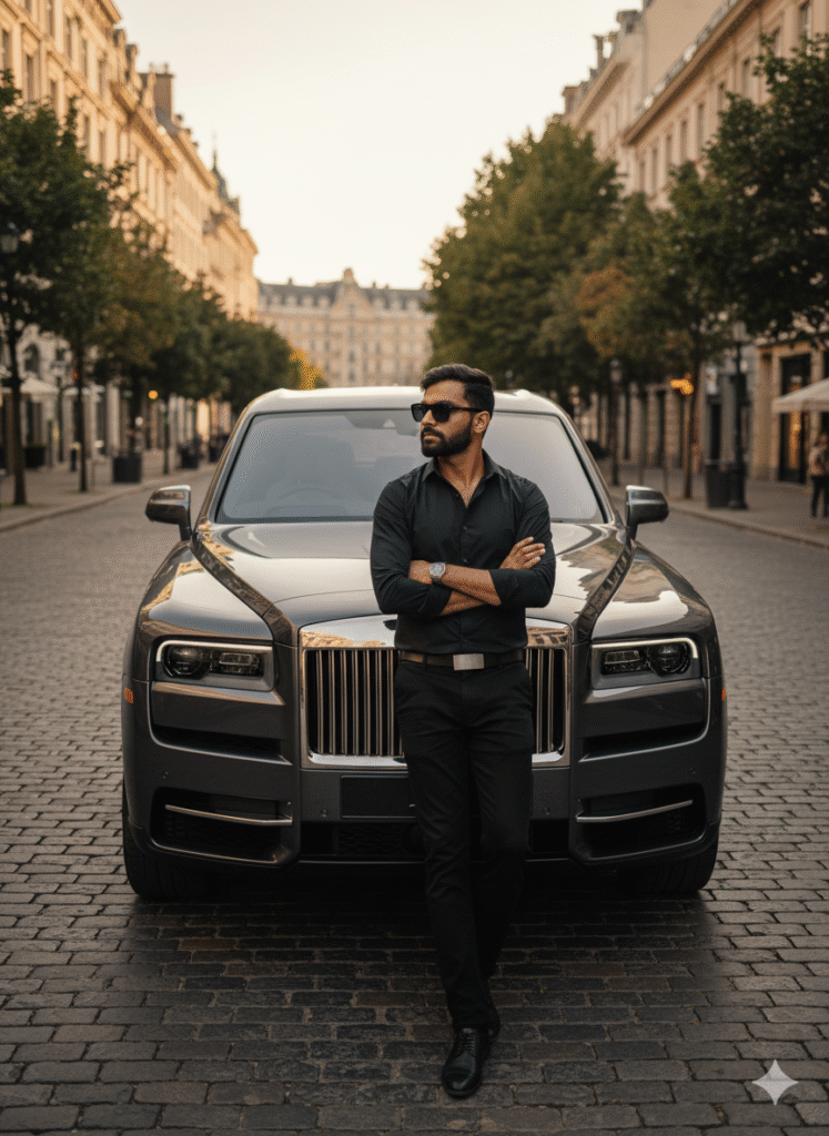 Prompt: 1/2 An ultra-luxury cinematic shot of a confident l man (same as uploaded photo ) posing with a Rolls Royce Cullinan on an empty cobblestone avenue. He wears a dark fitted shirt and sharp black sunglasses, exuding wealth and success. The man stands with his arms crossed against the car’s hood, his gaze focused into the distance. The background of elegant European-style buildings and trees gives a powerful, editorial magazine vibe. Shot in golden hour with dramatic shadows, 8K realism