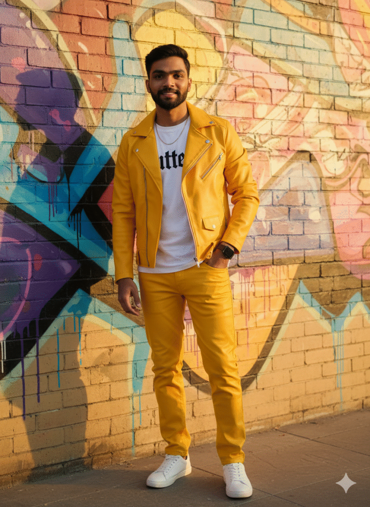A stylish young man standing outdoors against a graffiti-covered wall, wearing a bright yellow leather jacket with the word “Butter” written on the chest in black text, paired with matching yellow leather pants. He has a plain white t-shirt underneath, accessorized with a thin gold chain necklace and a black wristwatch. His short black hair is neatly styled, and he poses confidently with one hand in his pocket. The sunlight casts a warm golden glow on the scene, enhancing the vibrant yelloW