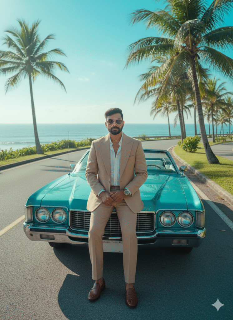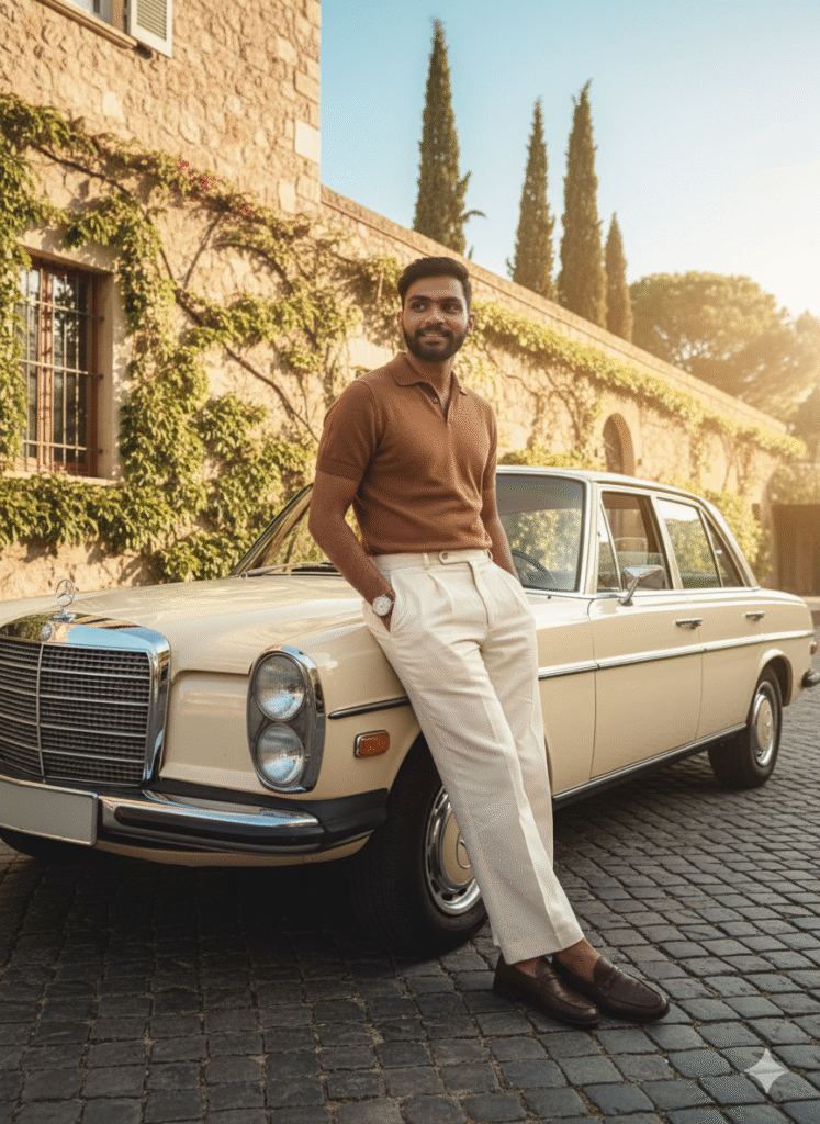 “Hyper-realistic cinematic photo using the uploaded face reference. Subject leaning against a vintage Mercedes-Benz, wearing brown polo tucked into ivory pleated trousers with dark brown loafers. Mediterranean summer vibe with golden sunlight, creamy highlights, dreamy glow, and soft shadows. Background of stone walls and cypress trees slightly blurred for depth. Styled like a 1970s fashion editorial with rich tones, cinematic blur, and authentic vintage film look.”Ultra-realistic vertical photo, 9:16. A young mix Indonesian-Asian man (use uploaded face, 100% identity lock, no alteration) sits on indoor stairs beside a matte concrete wall. A rectangular beam of golden sunlight from a window hits the wall and creates his crisp shadow silhouette inside the bright frame. He wears a black ribbed knit sweater, tapered grey chinos, and chunky white sneakers.