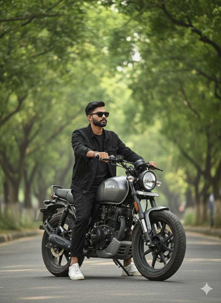 Ultra-realistic full-body shot of a stylish young man sitting confidently with a matte grey HERO EXTREME 160r 4v motorcycle under lush green trees. He has short black hair, black sunglasses, black denim jacket over a T-shirt, baggy black cargo pants, and white sneakers. One leg on the ground, and other leg on brake or gear , looking to the right. The bike has bold wide tires, dynamic retro design, black frame, and a jawa on the fuel tank. “A sleek modern bobber-style