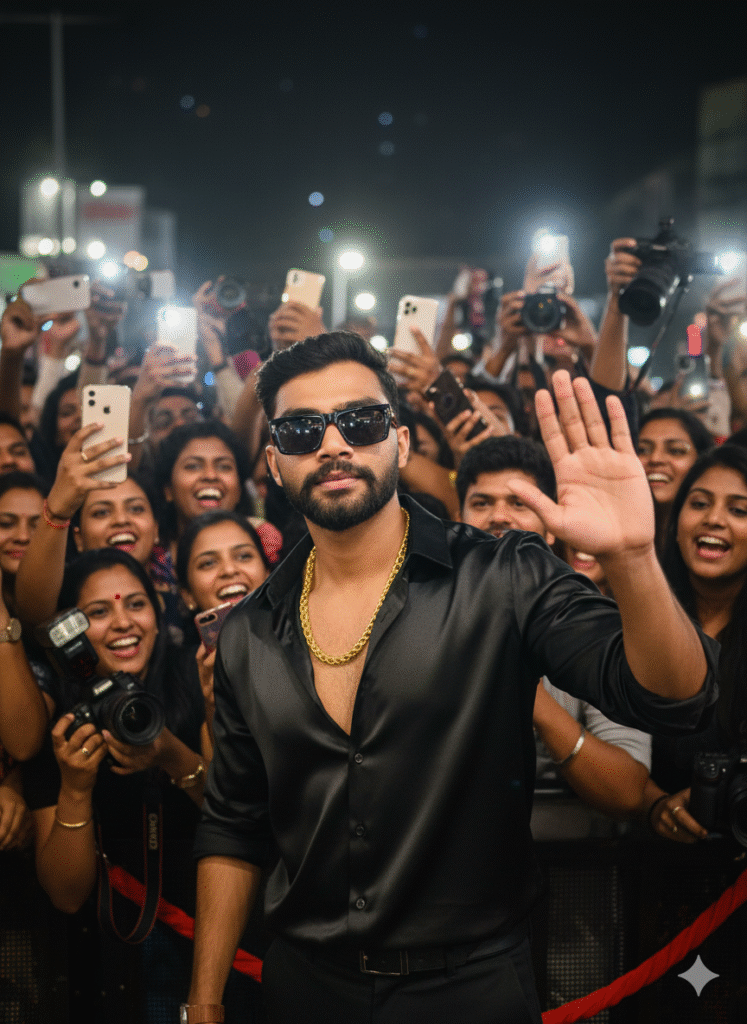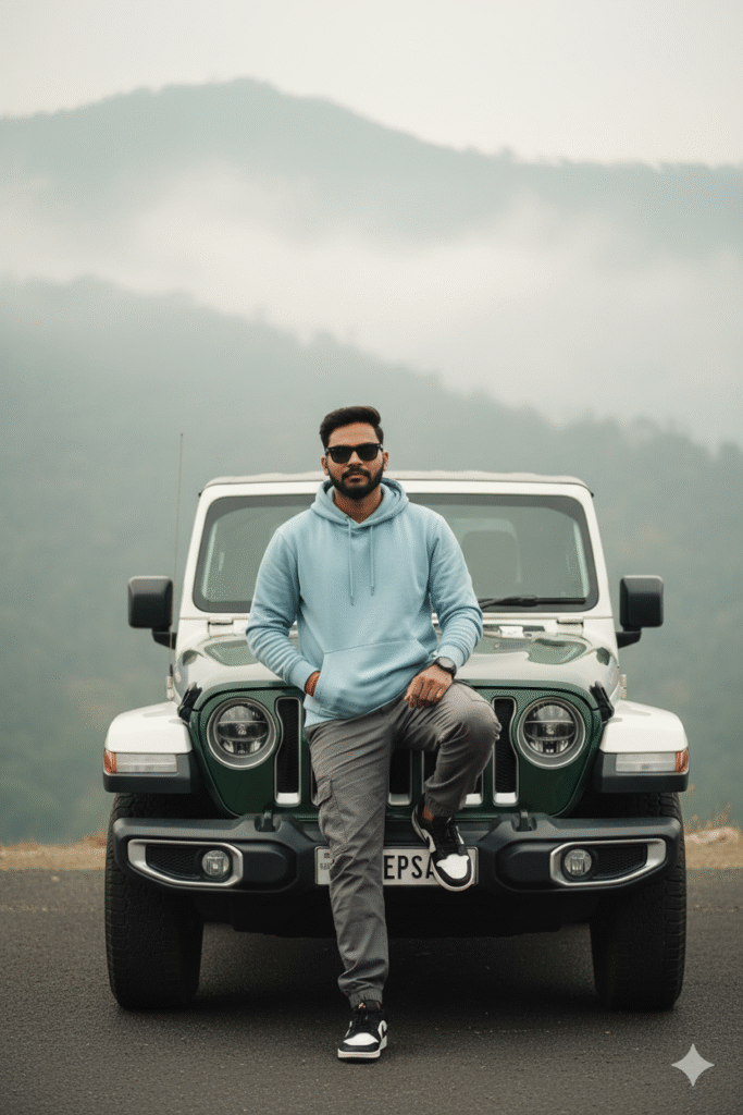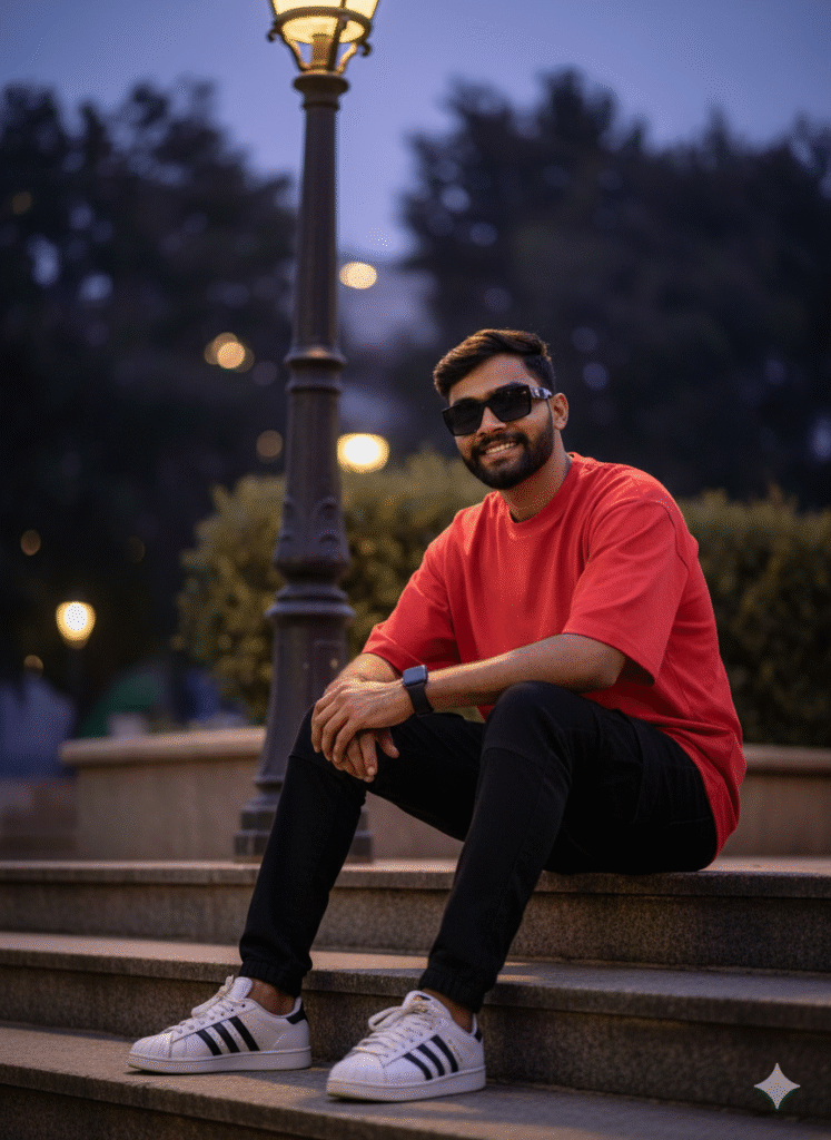 Ultra realistic candid photo of a young man (as in reference) wearing black shiny sunglasses and black silk button down shirt with thick golden chain standing in a crowded place with people holding cameras and taking photos. the person show his hand to audience .The background is filled with fans and a little chaos of crowd, giving a true celebrity vibe. The photo should look like a real-life captured moment, with natural lighting, sharp details, and authentic atmosphere. Edit this image of the man. He is wearing black sunglasses, a blue light hoodie, gray cargo pants, black-and-white Nike sneakers, and a black wristwatch. His pose is casual yet confident: left hand in the hoodie pocket, right hand resting casually on his knee. The man is sitting on the hood of a dark green and white Jeep Wrangler. The license plate ‘DEEPSA’ is clearly visible on the front of the car. The background shows mountains or hills covered in thick fog,Cinematic hyper-realistic shot of a 27-year-old man (same as uploaded photo don’t change hairstyle and facial expressions and) sitting on stone stairs beside an old lamp post at twilight. arms resting on knees. Outfit: Red Heavyweight oversized t-shirt, black cargo pants, white addidas sneakers, apple watch, wearing black shiny sunglasses. Background: glowing streetlight, blurred trees, creamy bokeh, 8K detail.