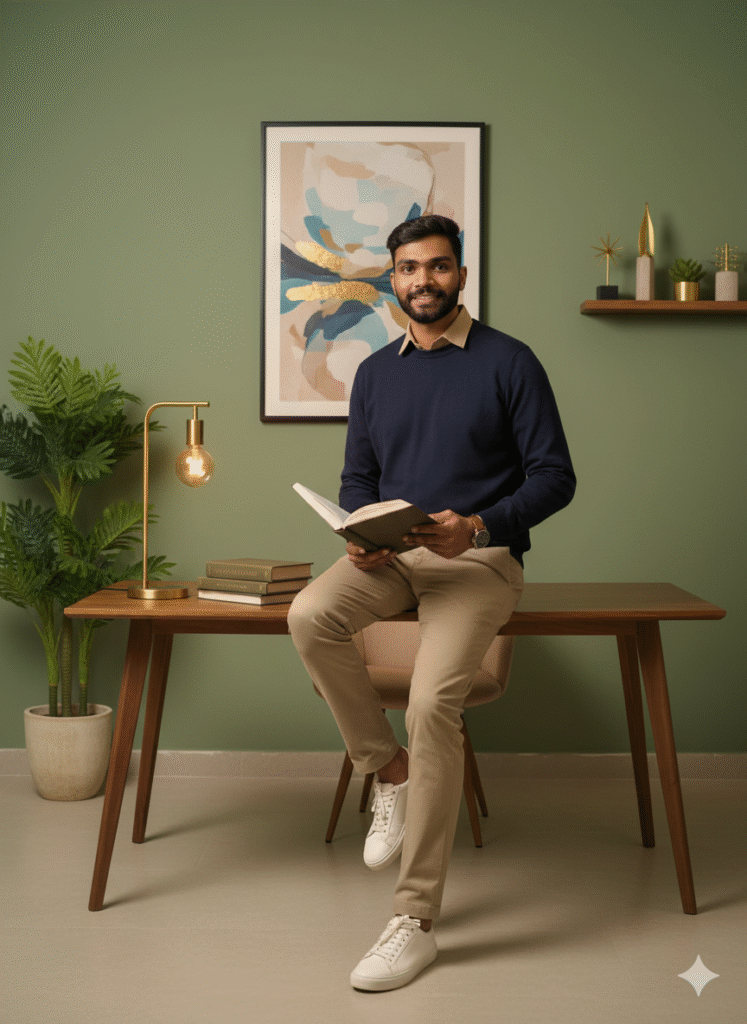 Ultra-realistic portrait of the same person from the uploaded photo, keeping identical facial features. The subject is sitting casually on the edge of a modern wooden office desk, holding an open book. Wearing a navy blue sweater over a beige shirt, beige pants, and white sneakers. The background features a green painted wall with a framed abstract artwork, a potted plant, and a small shelf with golden decor items. A minimal golden desk lamp and stacked books are on the desk. The scene is cozy, stylish, and professional, with cinematic lighting, soft shadows, and a natural warm tone. Shot in 3:4 vertical ratio, hyper- detailed, photo-realistic rendering