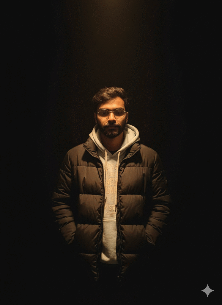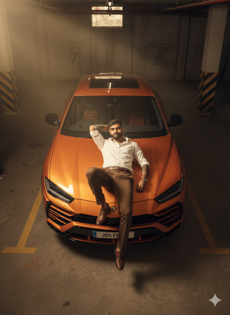 PROMPT #16 – Cinematic low-light portrait of a young man in a black puffer jacket over a grey hoodie, standing motionless under a soft amber spotlight. The glow grazes his glasses and hair while the surrounding darkness swallows the rest, creating a mood of quiet introspection.”PROMPT #17 – Hands in Pockets – Relaxed Authority A hyper-realistic cinematic editorial portrait of the uploaded person (preserve face 100%).He stands tall in a dark moody studio,surrounded by soft drifting smoke under a dramatic spotlight.Outfit:Fit slate-black luxury suit with fit-leg trousers, paired with a slightly unbuttoned white silk shirt. Both hands tucked casually in pockets, shoulders relaxed, confident expression, head tilted slightly upward.PROMPT #18 – Make my photo Overhead high angle 3:4 full-body shot of a man lying relaxed on the hood of an orange Lamborghini Urus in a dim basement garage. Wearing a crisp white open collar shirt, brown trousers, polished shoes, and a leather strap watch. Tattoo visible on forearm. Soft sunbeam lighting with natural reflections on car, cinematic warm color grading, shallow depth of field, creamy bokeh, hyper-realistic 8K detail, billionaire vibe.
