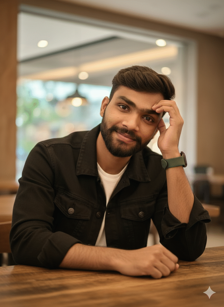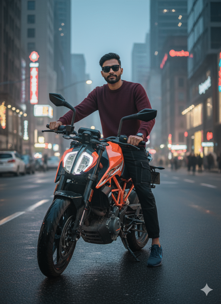 Create an ultra realistic, 8K resolution, high-detail cinematic image of a 20 years old handsome young man sitting on a ktm duke 390 bs6 motercycle on an empty street. Face with the face from the uploaded image, keeping the facial features exactly the same. and is wearing black sunglasses. He is dressed in a dark maroon wool sweater with rolled-up sleeves, dark black cargo pants with visible seams and pocket detailing, and sturdy blue nike sneakers with textured.Keep my exact face and body features from the givenpicture.A hyper-realistic portrait of me sitting at a wooden table, leaning slightly forward with one arm resting on the table. I am wearing a black denim jacket with rolled-up sleeves, and inside the jacket, a white t-shirt. On my wrist, I have a smartwatch with a dark green strap. My head is tilted slightly, with one hand resting casually and comfortably on my forehead. My hair is styled, and I have a soft,