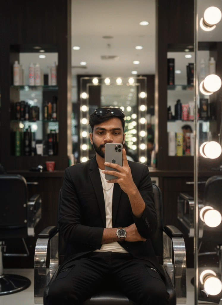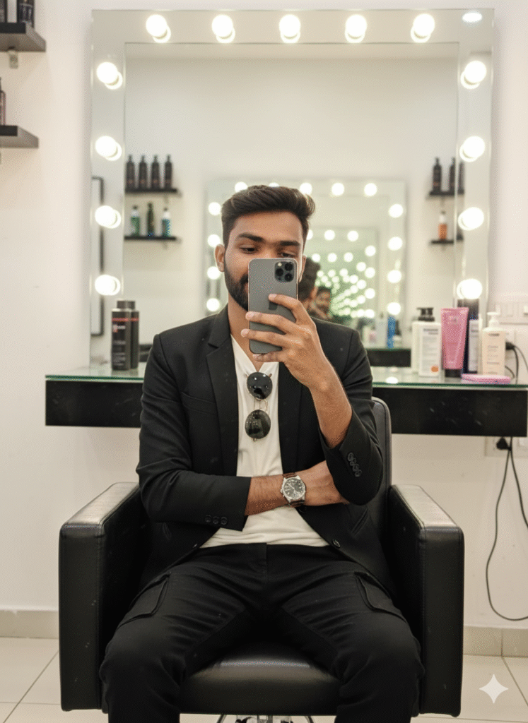 PROMPT #7 – Use my prompt “Ultra-realistic cinematic photo of a stylish young man sitting on a luxury salon chair in front of a big mirror, holding an iPhone 13 and clicking a selfie. He is wearing a trendy modern outfit with sunglasses/watch, giving a confident fashionable vibe. The background shows salon interiors with glowing vanity lights, hair products on the counter, and glossy reflections in the mirror. The scene has a cinematic lifestyle tone, shot with a Sony A7R IV, 35mm f/1.4 lens,