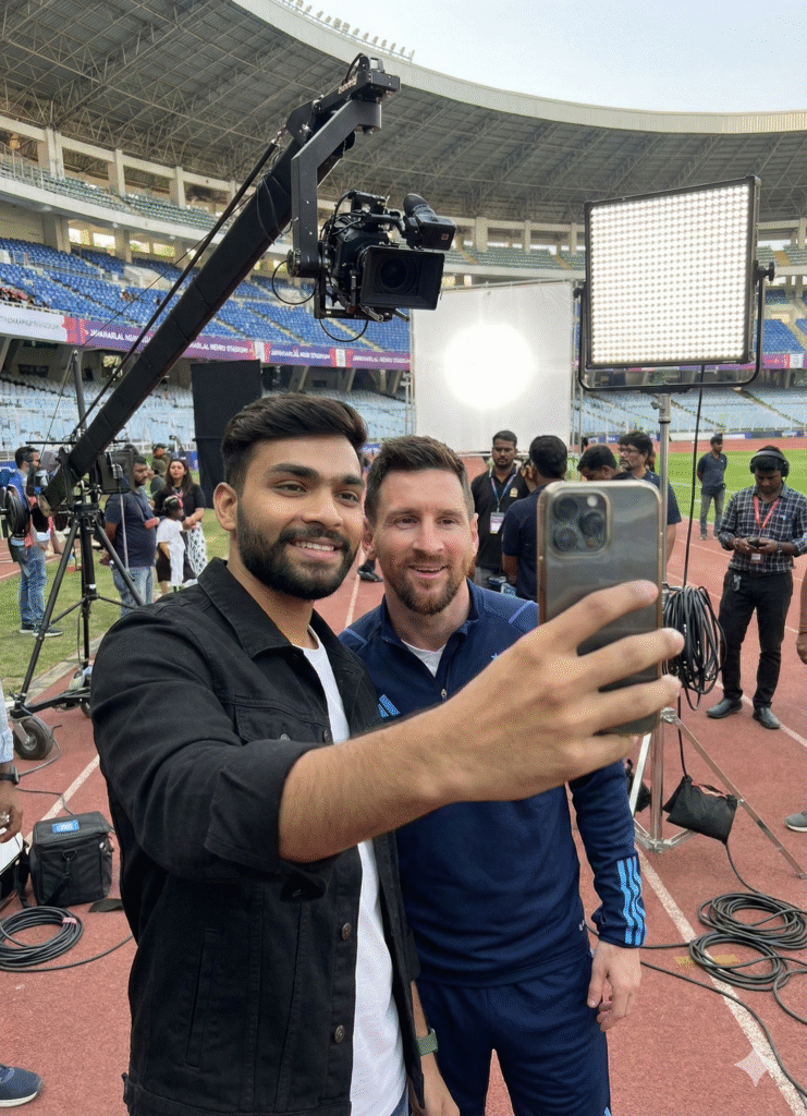 Generate a candid selfie-style photo taken on the production set of [SHOW NAME]. The individual from the uploaded reference image is capturing a front-facing self- portrait with their arm extended toward the camera. Keep this person’s facial features, hair, physique, outfit, and overall look completely unchanged – maintain their exact appearance. [ACTOR/CHARACTER NAME] appears alongside them in the frame. The scene reveals the famous [SPECIFIC SET/LOCATION] in a genuine filming environment – avoid any green screen appearance. Display professional filming gear, studio lights, and production tools scattered throughout the background for an authentic on-set vibe.”
