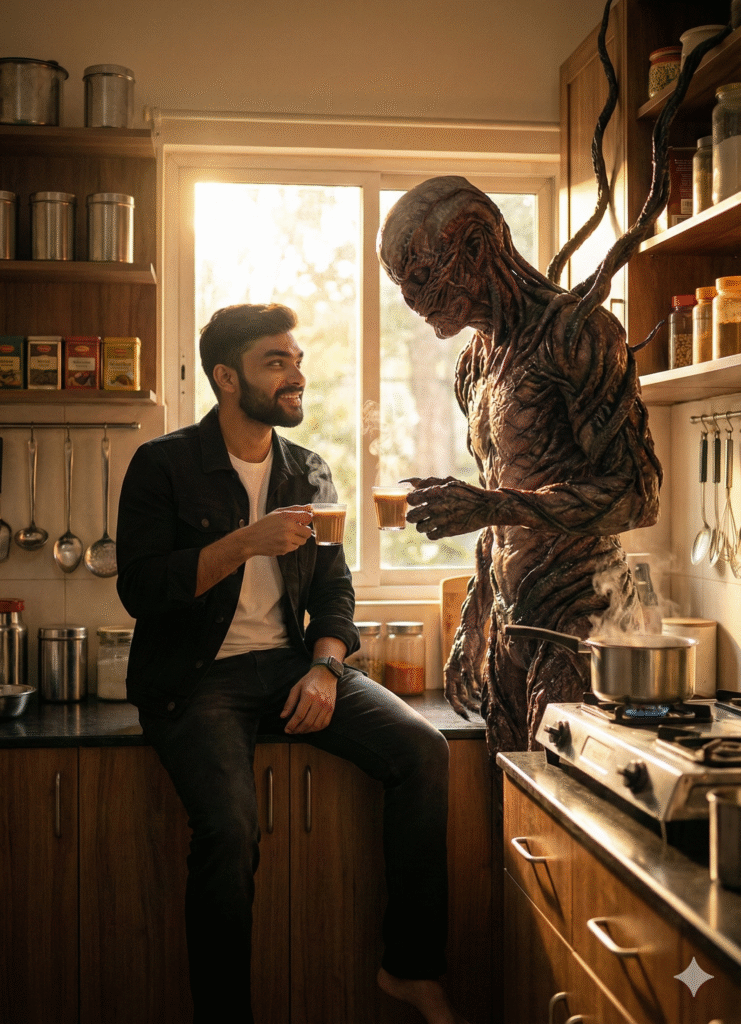 Prompt – “Create a hyper-realistic cinematic scene of me inside a small Indian kitchen, sitting casually on the kitchen counter, smiling and holding a hot cup of chai. Use my uploaded photo for the face, expression, skin tone, beard and hairstyle — keep my look natural and unchanged.Next to me, include a detailed, intimidating Vecna-style monster (from Stranger Things), tall and covered in dark organic vines and twisted skin texture. The Vecna creature is politely offering chai to me, creating a contrast between horror and humor.Add warm morning sunlight entering through a window behind Vecna, soft atmospheric smoke/steam from the chai, and realistic shadows. The mood should feel friendly, cinematic, and surreal.Keep my original clothes from the photo. Maintain the same kitchen setup: steel utensils, spice box, gas stove, sink, and warm tones. Ultra-realistic lighting, 50mm lens, shallow depth of field, movie-grade texture.”