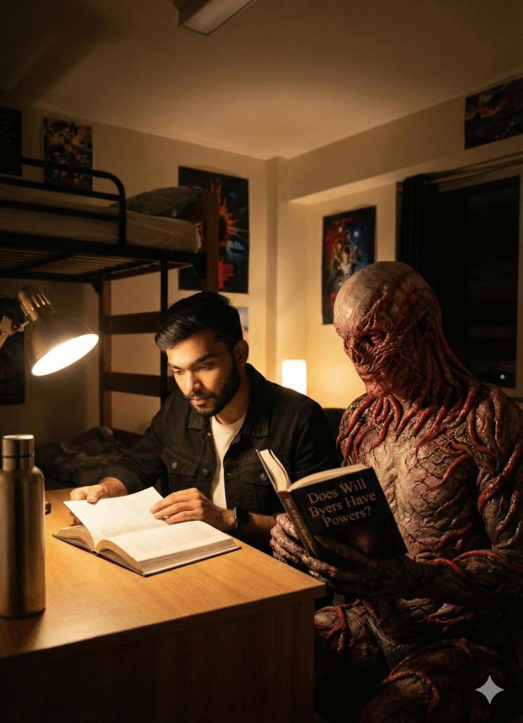 Here is the same-to-same ultra-realistic “Vecna studying with you in the hostel room” prompt, fully adapted to your face from the selfie you uploaded earlier.